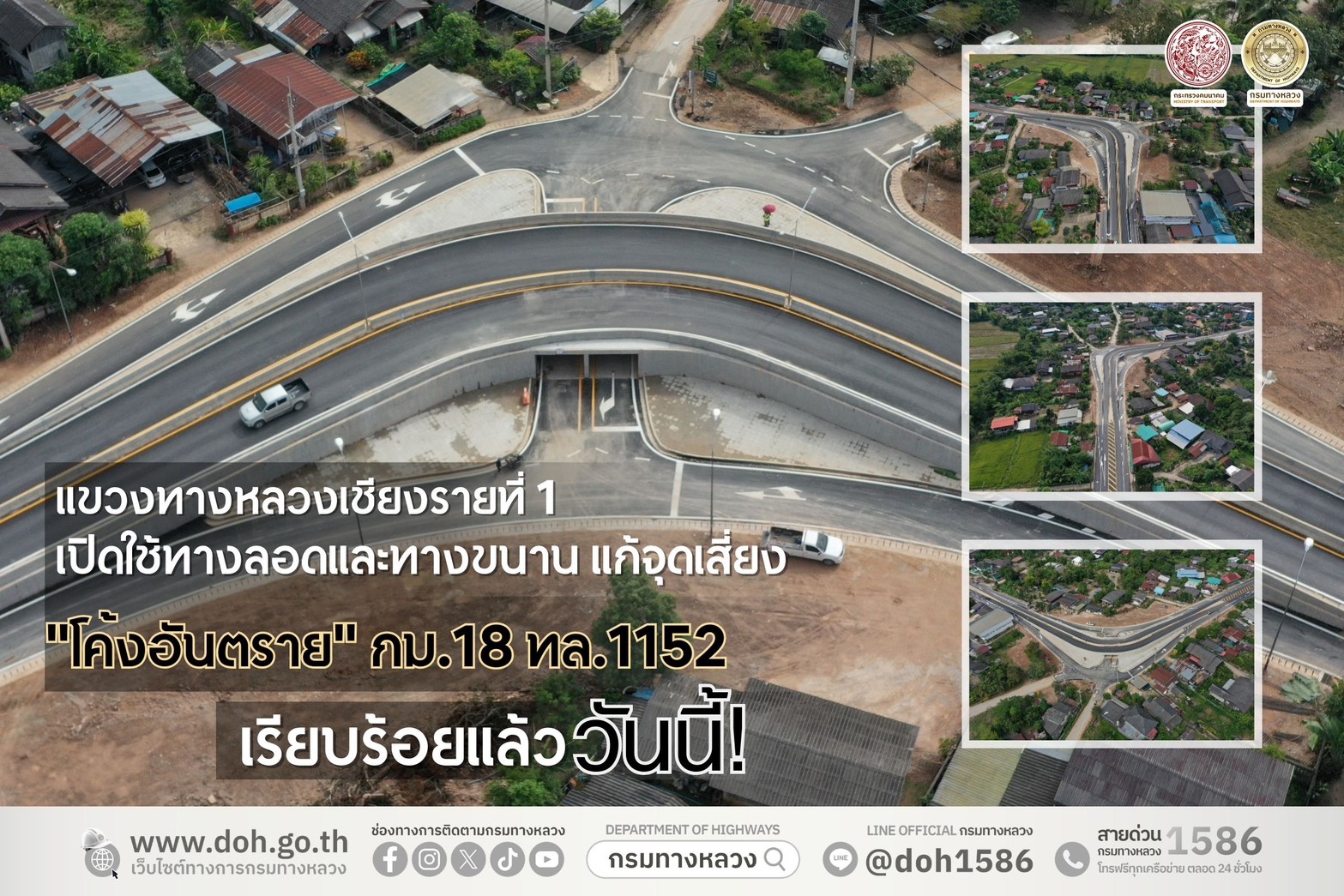 13 19/03/2569 แขวงทางหลวงเชียงรายที่ 1 เปิดใช้ทางลอดและทางขนาน แก้จุดเสี่ยง "โค้งอันตราย" กม.18 ทล.1152 เรียบร้อยแล้ววันนี้!