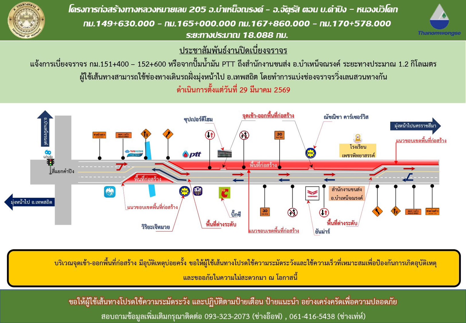 9 24/03/2569 กรมทางหลวง แจ้งปิดและเบี่ยงการจราจรบนทางหลวงหมายเลข 205 อ.บำเหน็จณรงค์ - อ.จัตุรัสจ.ชัยภูมิ ระยะทาง 1.2 กม. ตั้งแต่วันที่ 29 มี.ค. 69 เป็นต้นไป สอบถามโทรสายด่วน 1586