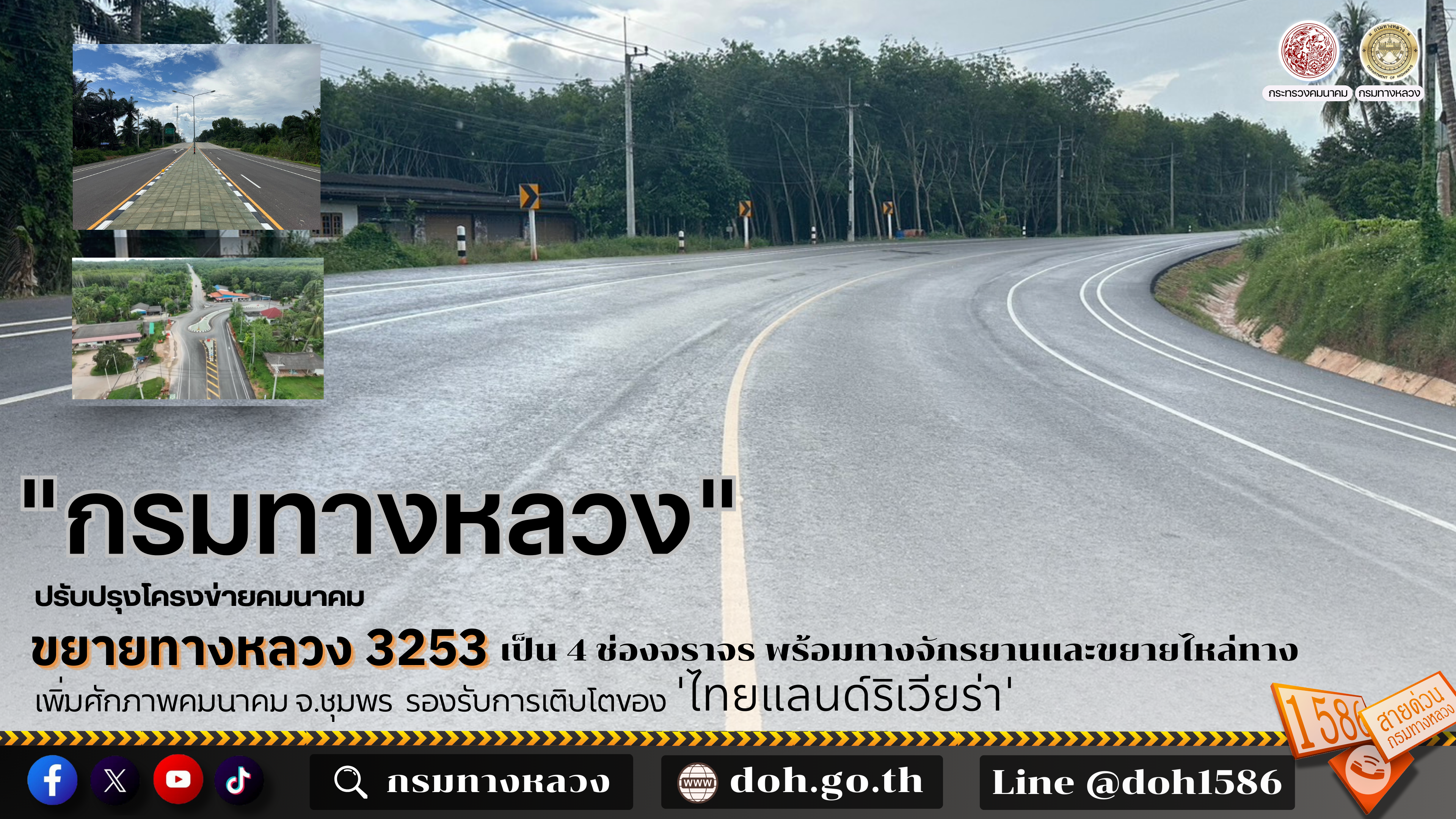กรมทางหลวงปรับปรุงโครงข่ายคมนาคม ขยายทางหลวง 3253 เป็น 4 ช่องจราจร พร้อมทางจักรยานและขยายไหล่ทาง เพิ่มศักยภาพคมนาคม จ.ชุมพร รองรับการเติบโตของ “ไทยแลนด์ริเวียร่า”