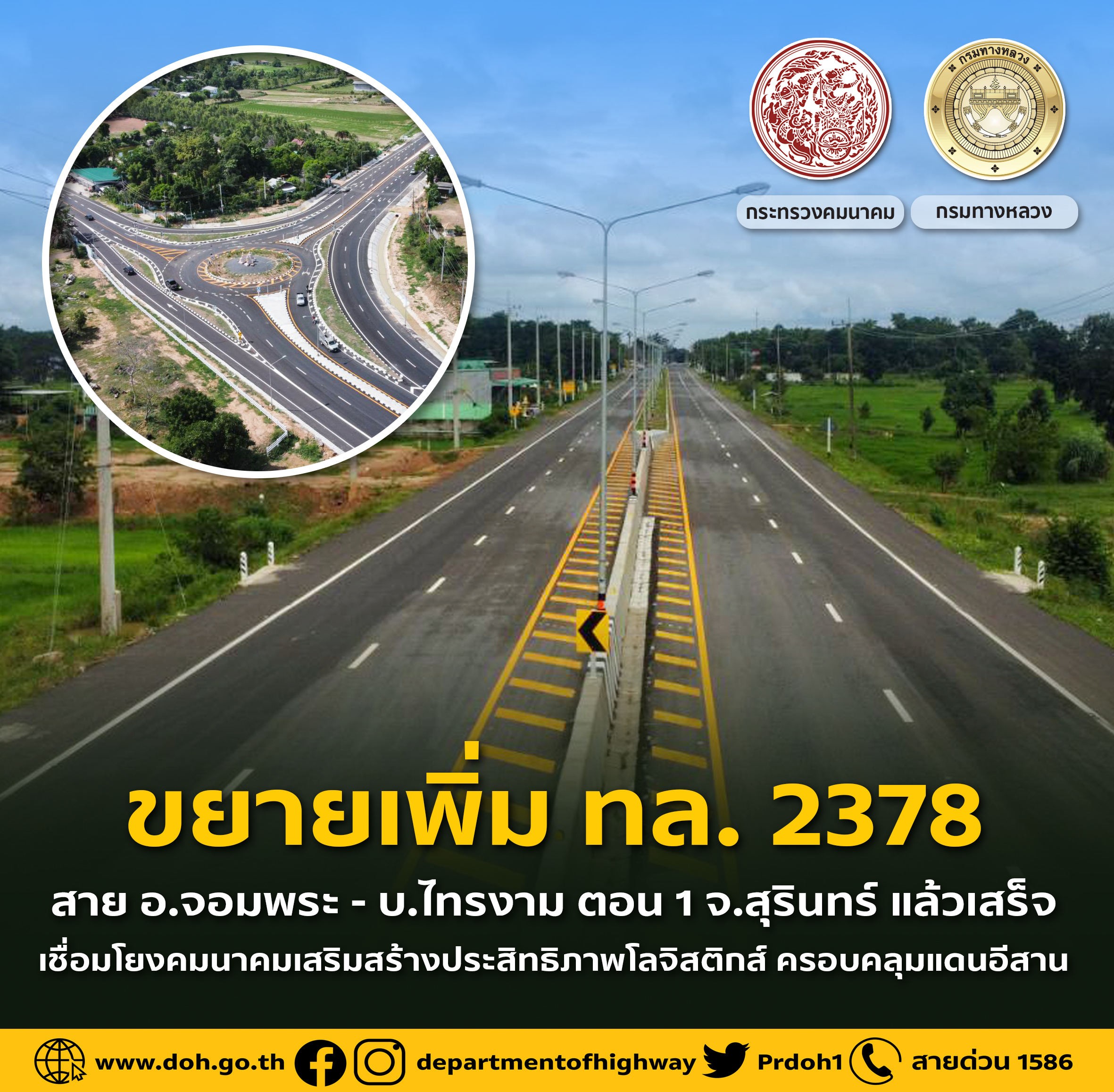 ขยายเพิ่ม ทล.2378 สาย อ.จอมพระ - บ.ไทรงาม ตอน 1 จ.สุรินทร์ แล้วเสร็จ เชื่อมโยงคมนาคมเสริมสร้างประสิทธิภาพโลจิสติกส์ ครอบคลุมแดนอีสาน