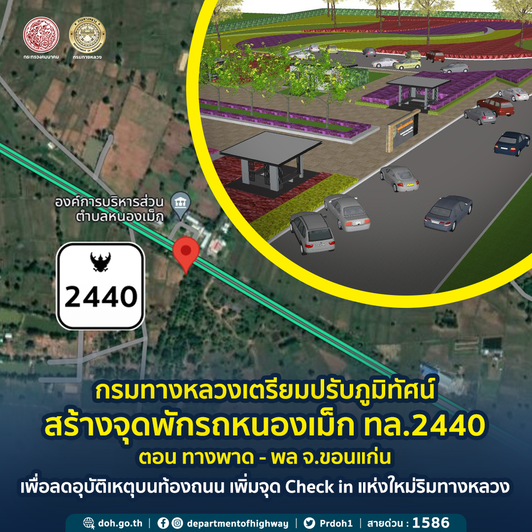 250 12/06/2567 กรมทางหลวงเตรียมปรับภูมิทัศน์ “สร้างจุดพักรถหนองเม็ก ทล.2440 ตอน ทางพาด - พล จ.ขอนแก่น” เพื่อลดอุบัติเหตุ และจุด Check in แห่งใหม่ริมทางหลวง