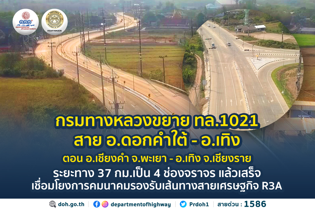 กรมทางหลวงขยายทางหลวงหมายเลข 1021 สาย อ.ดอกคำใต้ – อ.เทิง ตอน อ.เชียงคำ จ.พะเยา – อ.เทิง จ.เชียงราย ระยะทาง 37 กม. เป็น 4 ช่องจราจรแล้วเสร็จ เชื่อมโยงการคมนาคม รองรับเส้นทางสายเศรษกิจ R3A