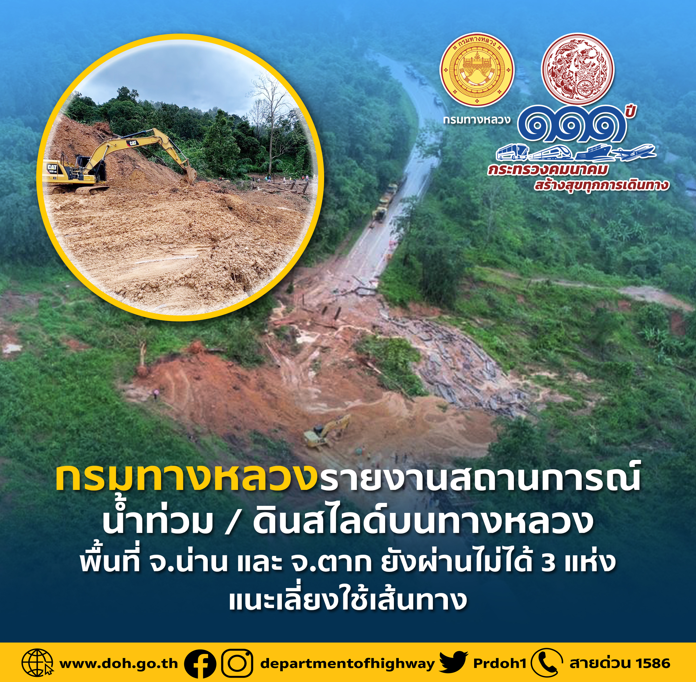 กรมทางหลวงรายงานสถานการณ์น้ำท่วม / ดินสไลด์บนทางหลวง พื้นที่ จ.น่าน และ จ.ตาก ยังผ่านไม่ได้ 3 แห่ง แนะเลี่ยงใช้เส้นทาง
