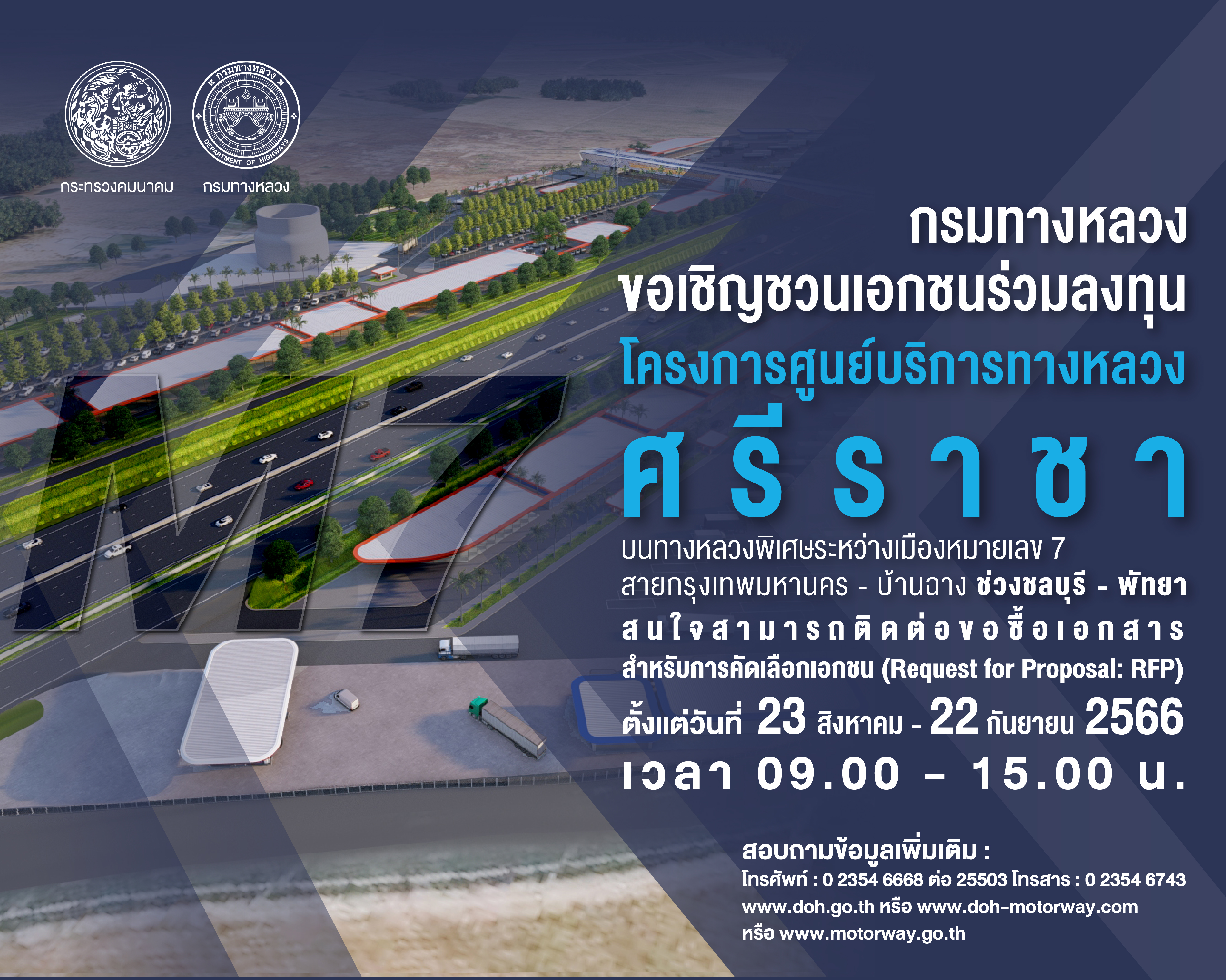 ประกาศเชิญชวน การให้เอกชนร่วมลงทุนในการพัฒนาและบริหารจัดการ โครงการศูนย์บริการทางหลวงศรีราชา บนทางหลวงพิเศษระหว่างเมืองหมายเลข 7 สายกรุงเทพมหานคร - บ้านฉาง ช่วงชลบุรี - พัทยา