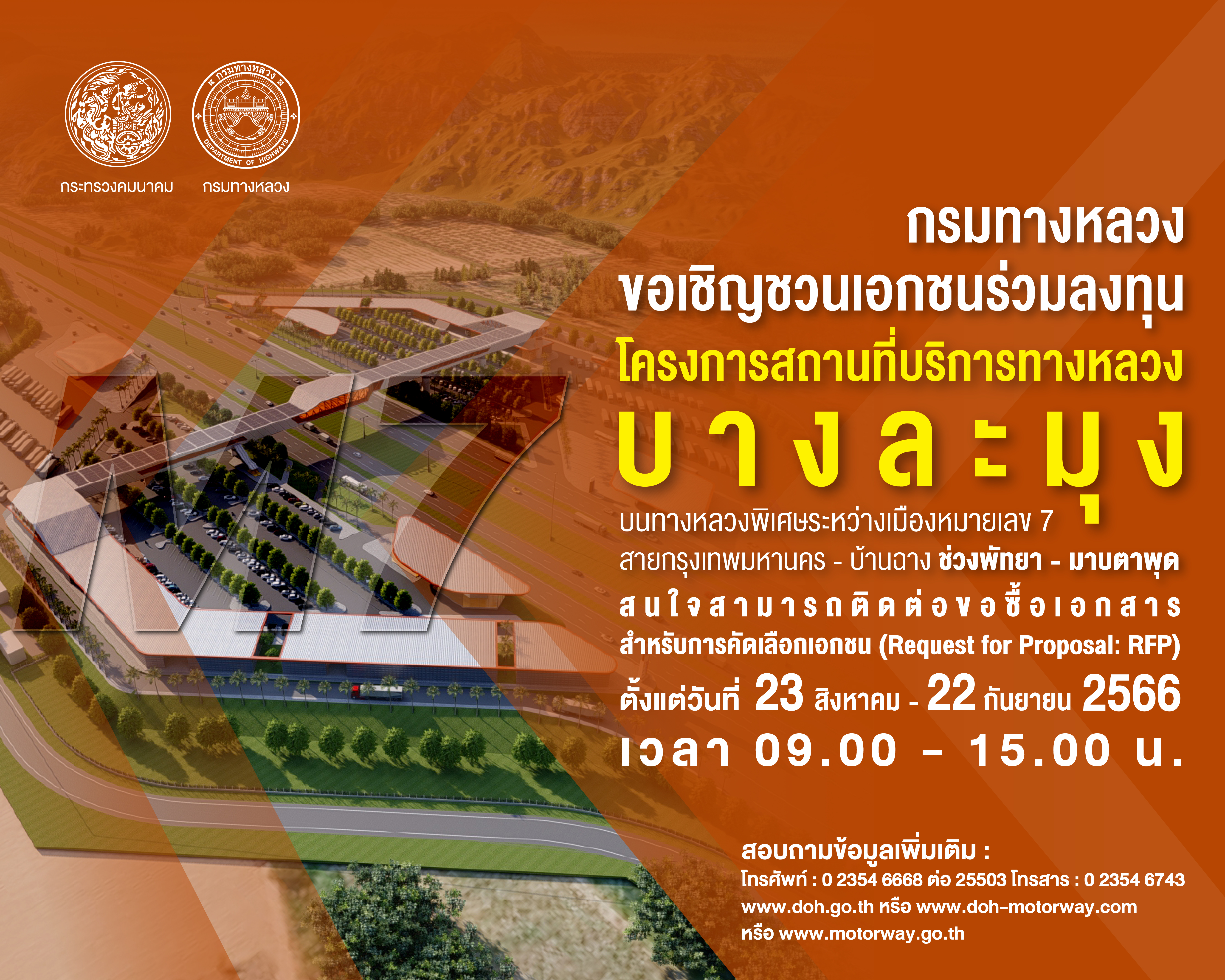 กรมทางหลวง แถลงแผนการประมูลคัดเลือกเอกชนร่วมลงทุนที่พักริมทางบนมอเตอร์เวย์สาย 7 เปิดจำหน่ายเอกสาร RFP 23 ส.ค.- 22 ก.ย. 66 คาดคัดเลือกเอกชนแล้วเสร็จต้นปี 2567
