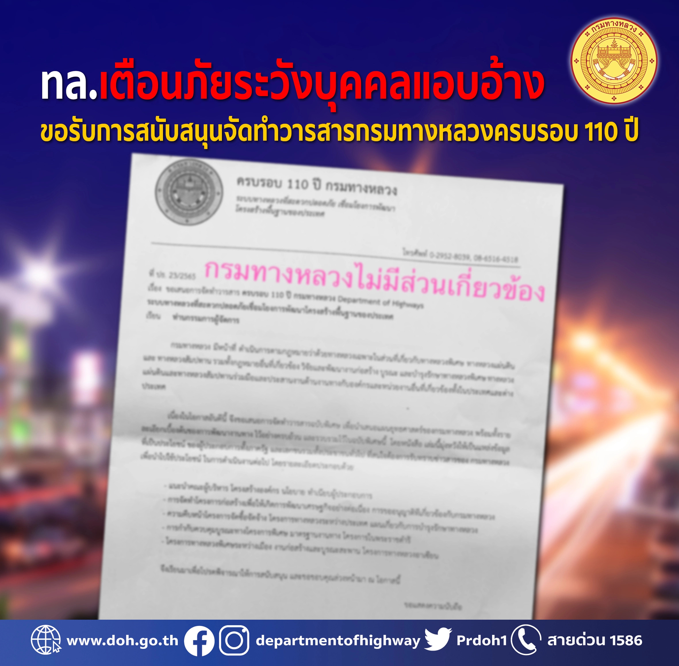 ทล.เตือนภัยระวังบริษัทแอบอ้างเป็นกรมทางหลวง ขอรับการสนับสนุนจัดทำวารสารกรมทางหลวงครบรอบ 110 ปี