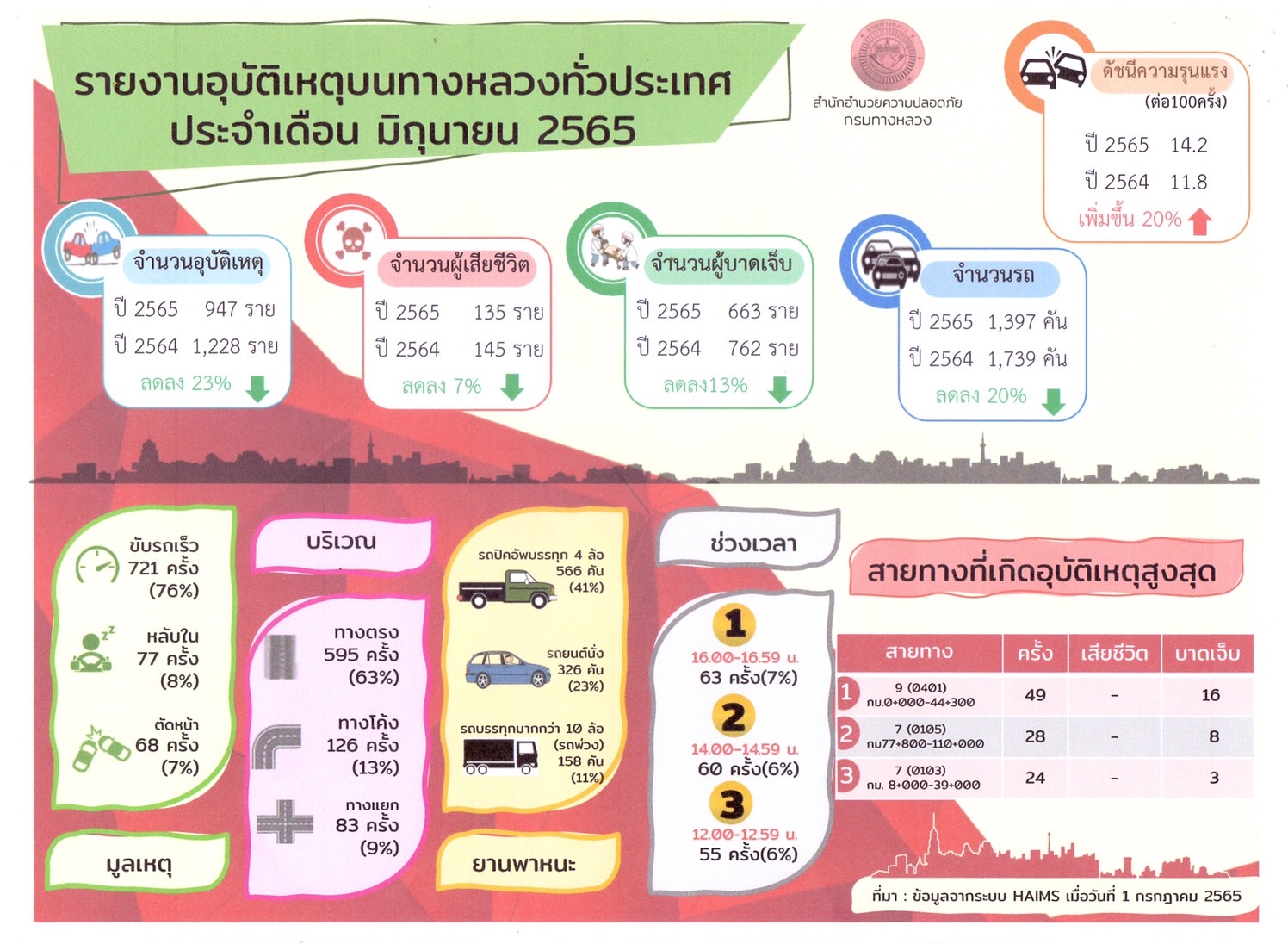 กรมทางหลวง สรุปอุบัติเหตุบนทางหลวงเดือนมิถุนายน 2565 พบอุบัติเหตุลดลง 23% สาเหตุหลักขับเร็วเกินกฎหมายกำหนด