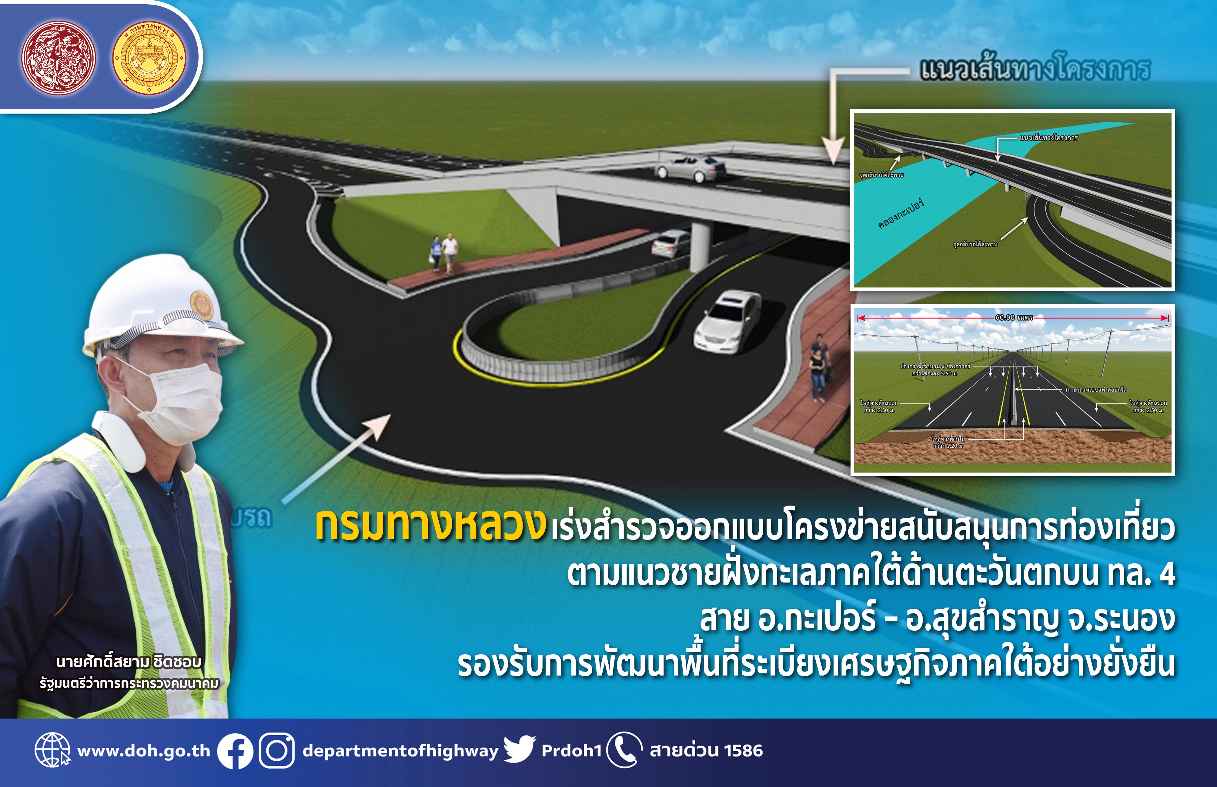 กรมทางหลวงเร่งสำรวจออกแบบโครงข่ายสนับสนุนการท่องเที่ยวตามแนวชายฝั่งทะเลภาคใต้ด้านตะวันตกบน ทล. 4 สาย อ.กะเปอร์ – อ.สุขสำราญ จ.ระนอง รองรับการพัฒนาพื้นที่ระเบียงเศรษฐกิจภาคใต้อย่างยั่งยืน