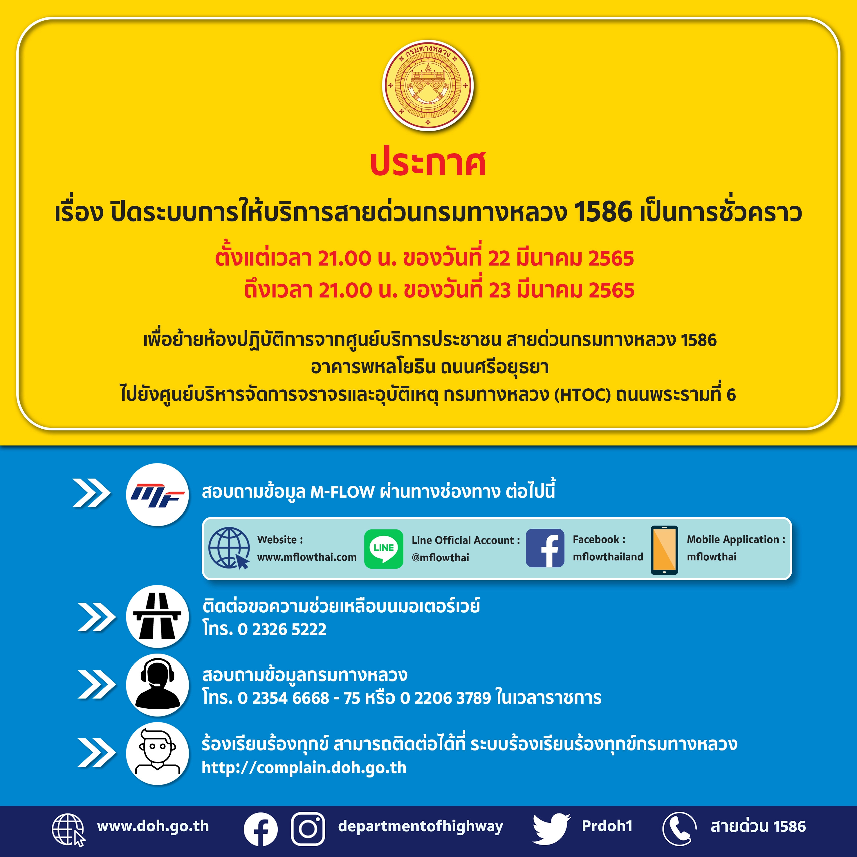 สายด่วน Call Center 1586 ปิดระบบการให้บริการชั่วคราว? ระหว่างวันที่ 22 มี.ค. 2565 เวลา 21.00 น. ถึง วันที่ 23 มี.ค. 2565 เวลา 21.00 น.