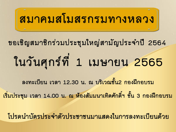 สมาคมสโมสรกรมทางหลวง ขอเชิญสมาชิกร่วมประชุมใหญ่สามัญประจำปี 2564 ในวันศุกร์ที่ 1 เมษายน 2565