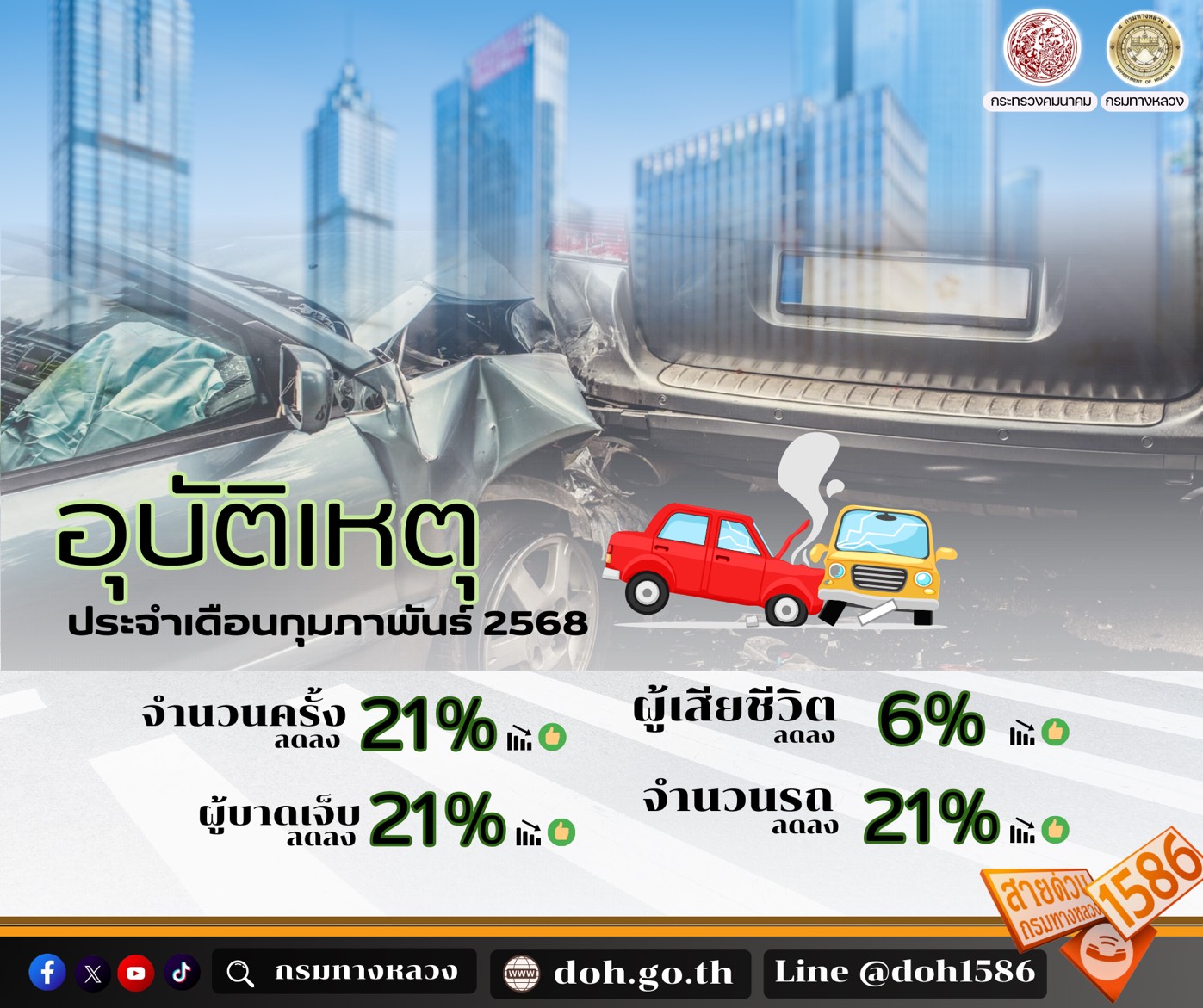 134 14/03/2568 กรมทางหลวง สรุปอุบัติเหตุบนทางหลวงเดือนกุมภาพันธ์ 2568 พบอุบัติเหตุลดลง 21% สาเหตุหลักขับเร็วเกินกฎหมายกำหนด
