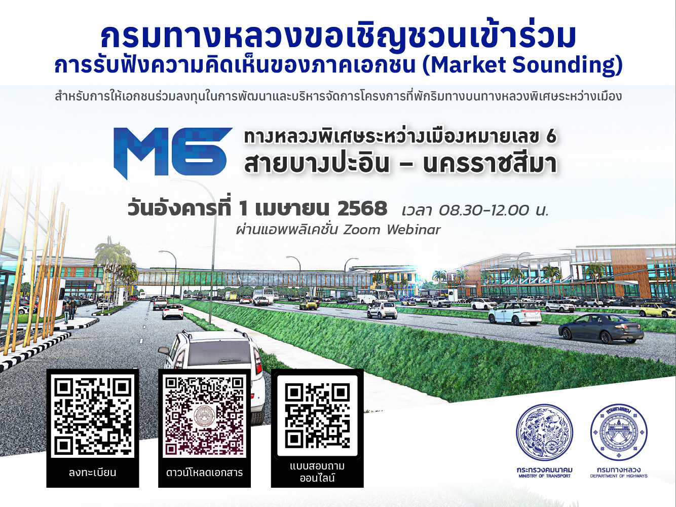 133 14/03/2568 กรมทางหลวงเปิดรับฟังความคิดเห็นภาคเอกชน (Market Sounding) สำหรับการให้เอกชนร่วมลงทุนในการพัฒนาและบริหารจัดการโครงการที่พักริมทางบนทางหลวงพิเศษระหว่างเมืองหมายเลข 6 สายบางปะอิน-นครราชสีมา