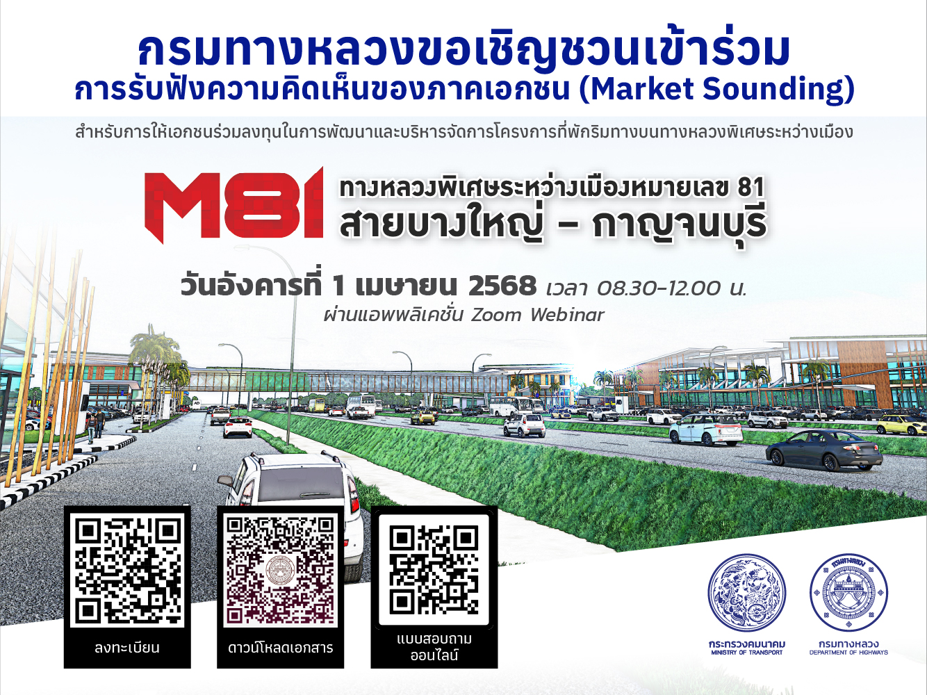 132 14/03/2568 กรมทางหลวงเปิดรับฟังความคิดเห็นภาคเอกชน (Market Sounding) สำหรับการให้เอกชนร่วมลงทุนในการพัฒนาและบริหารจัดการโครงการที่พักริมทางบนทางหลวงพิเศษระหว่างเมืองหมายเลข 81 สายบางใหญ่-กาญจนบุรี