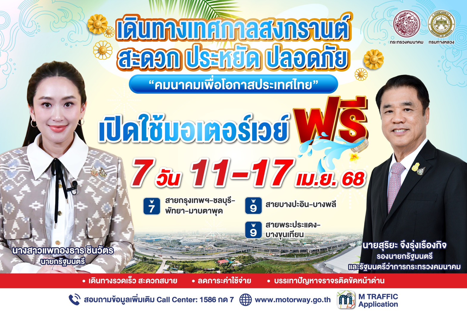 122 01/04/2568 ฟรี 7 วัน! กรมทางหลวง เปิดฟรีมอเตอร์เวย์ระหว่างวันที่ 11 – 17 เม.ย. 68 เพื่ออำนวยความสะดวกในการเดินทางแก่ประชาชนช่วงเทศกาลสงกรานต์ 2568