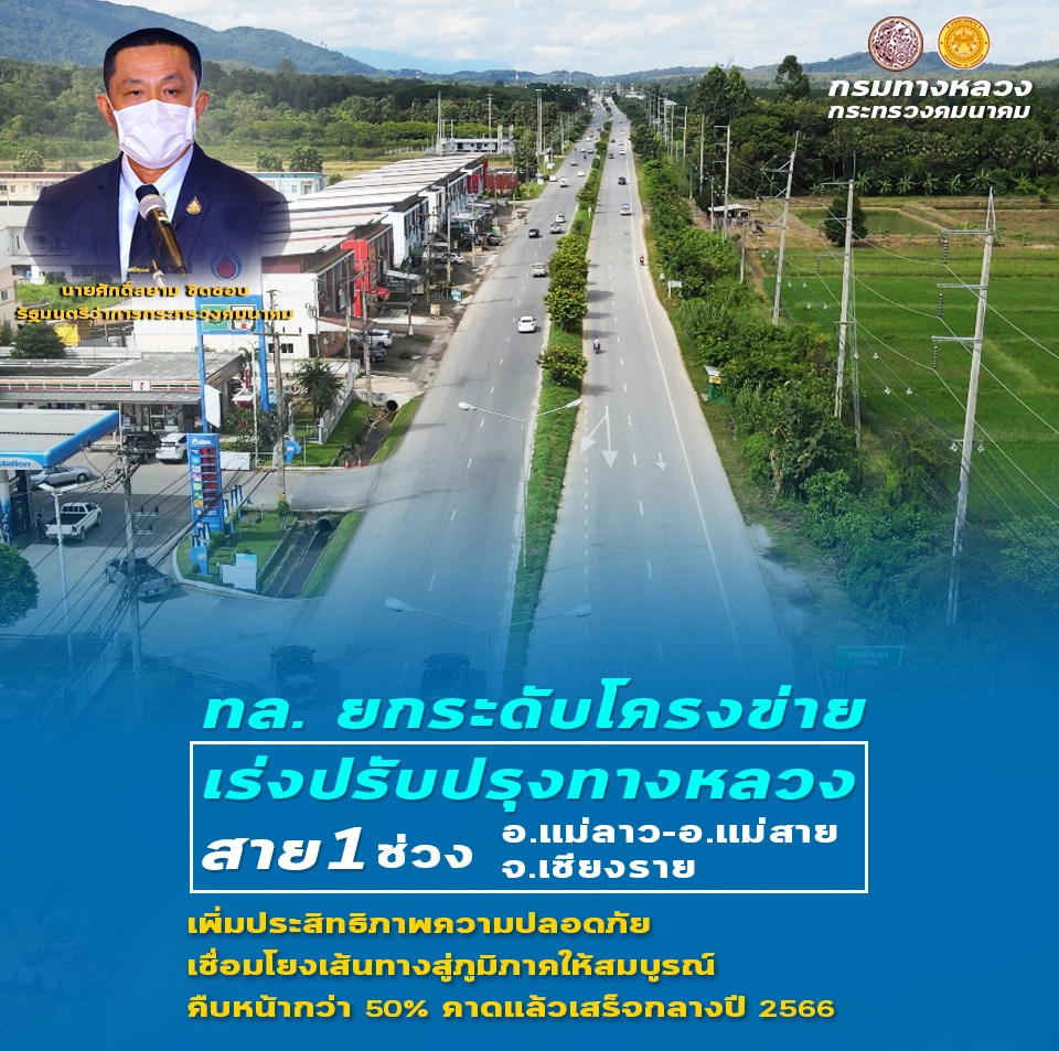 นายสราวุธ ทรงศิวิไล อธิบดีกรมทางหลวง เปิดเผยว่า ตามที่นายศักดิ์สยาม ชิดชอบ รัฐมนตรีว่าการกระทรวงคมนาคมได้มอบนโยบายการพัฒนาโครงสร้างพื้นฐานด้านคมนาคมขนส่งปรับปรุงโครงสร้างพื้นฐานทางถนนในพื้นที่ภาคเหนือ พร้อมเร่งรัดโครงการบูรณะโครงข่ายทางหลวงเชื่อมโยงระหว่างภาคทางหลวงหมายเลข 1 สาย อ.แม่ลาว-อ.แม่สาย ระยะทาง 95.57 กิโลเมตร ให้แล้วเสร็จทันตามกำหนดเวลา เพื่อเสริมสร้างโครงข่ายทางหลวงพื้นที่ภาคเหนือให้สมบูรณ์ตลอดสายทาง