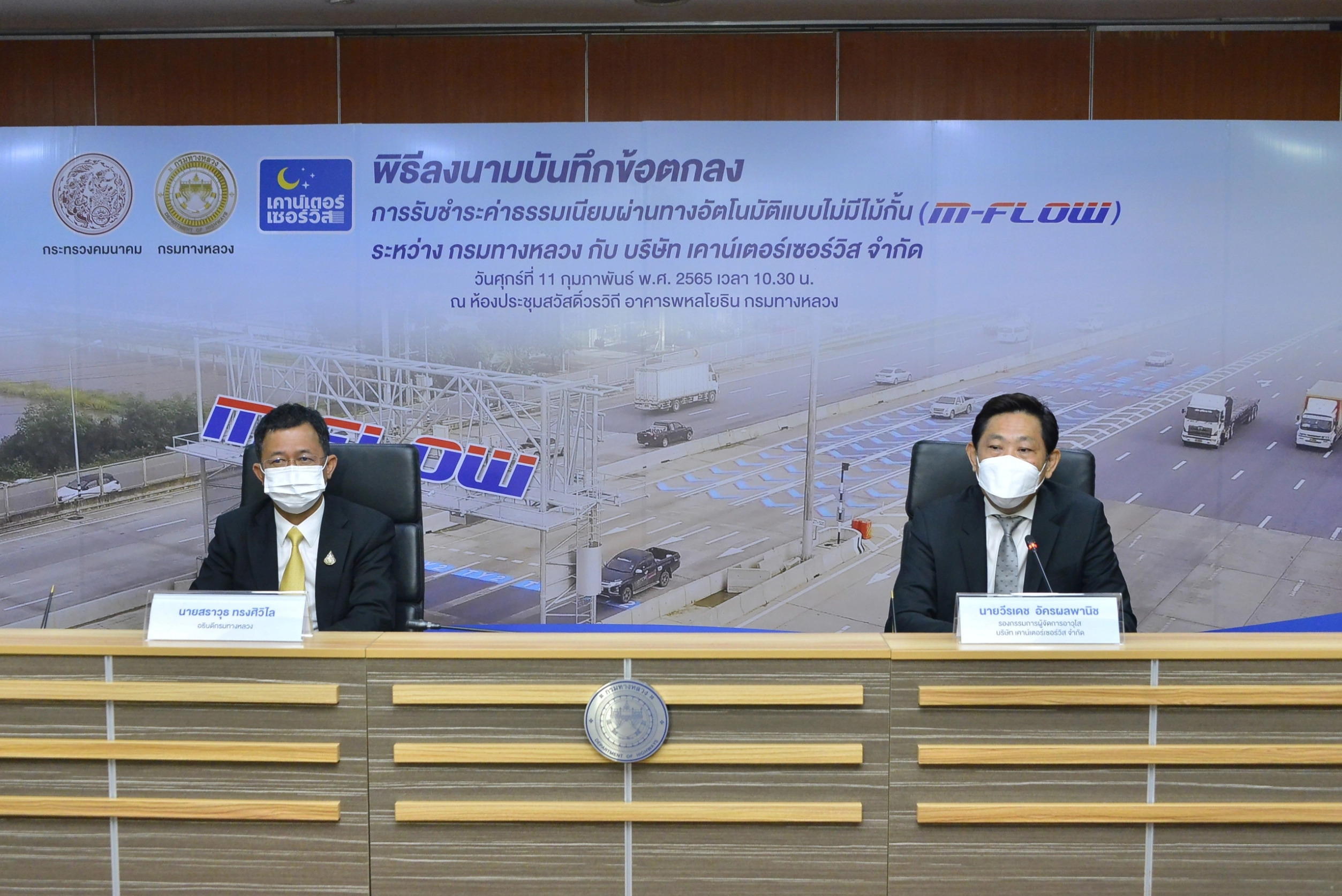 วันนี้ (11 ก.พ. 65) นายสราวุธ ทรงศิวิไล อธิบดีกรมทางหลวง และ นายวีรเดช อัครผลพานิช รองกรรมการผู้จัดการอาวุโส บริษัท เคาน์เตอร์เซอร์วิส จำกัด ร่วมลงนามบันทึกข้อตกลง การรับชำระค่าธรรมเนียมผ่านทางอัตโนมัติแบบไม่มีไม้กั้น (M-Flow) ระหว่างกรมทางหลวง กับ เคาน์เตอร์เซอร์วิส จำกัด ในวันศุกร์ที่ 11 กุมภาพันธ์ 2565 เวลา 10.30 น. ณ ห้องประชุมสวัสดิ์วรวิถี กรมทางหลวง