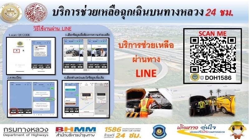 ทั้งนี้ กรมทางหลวงพร้อมดูแลด้านความปลอดภัยการเดินทางของประชาชนเป็นพิเศษเพื่อลดการสูญเสียทั้งชีวิตและทรัพย์สิน อย่างไรก็ตาม ขอความร่วมมือผู้ใช้ทางขับขี่ด้วยความระมัดระวังปฏิบัติตากฎจราจร วางแผนการเดินทางล่วงหน้า เตรียมร่างกายให้พร้อม หากประชาชนต้องการสอบถามข้อมูลการเดินทางเพิ่มเติมหรือแจ้งเหตุด่วนเหตุร้ายระหว่างเดินทางสามารถติดต่อได้ที่สายด่วนกรมทางหลวง 1586 มอเตอร์เวย์ 1586 กด 7 (โทรฟรีทุกเครือข่ายตลอด 24 ชั่วโมง) และตำรวจทางหลวง 1193 หากต้องการขอความช่วยเหลือเมื่อเกิดอุบัติเหตุหรือรถเสียสามารถสแกน QR CODE และติดตั้งแอพพลิเคชั่น Line @1586 กรมทางหลวงพร้อมให้ความช่วยเหลือ 24 ชั่วโมง