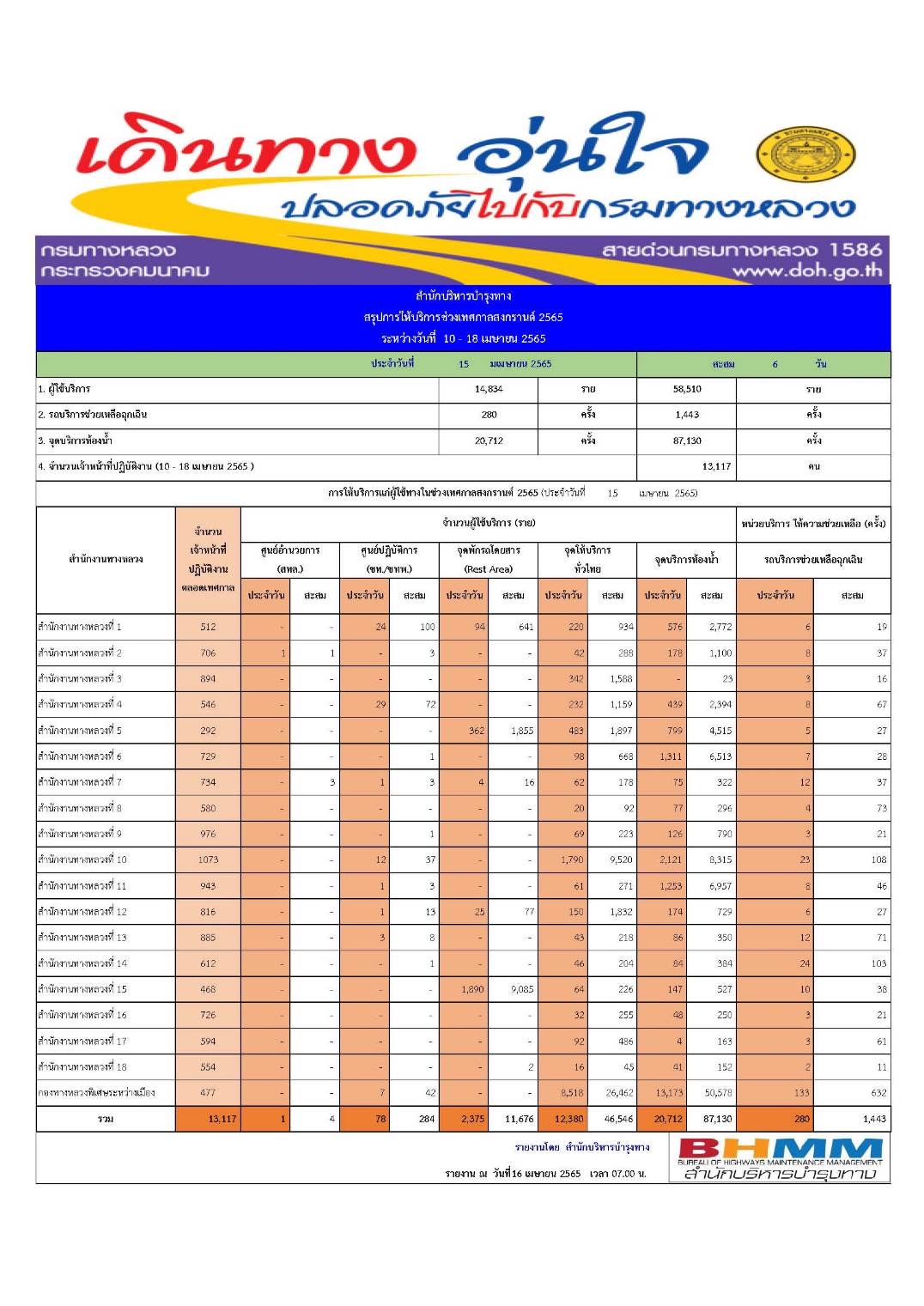 ทั้งนี้ในช่วงที่ผ่านมาระหว่างวันที่ 10 – 15 เมษายน 2565 กรมทางหลวงได้จัดเจ้าหน้าที่ปฎิบัติงานอำนวยความสะดวกให้กับประชาชนตามจุดต่าง ๆ ทั่งประเทศจำนวน 13,117 คน โดยมียอดผู้ใช้บริการสะสมรวม 6 วัน แบ่งเป็น