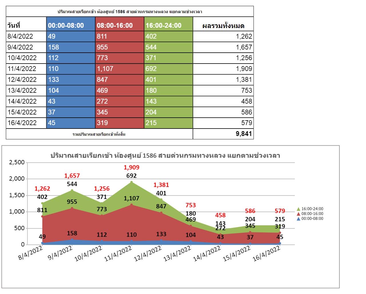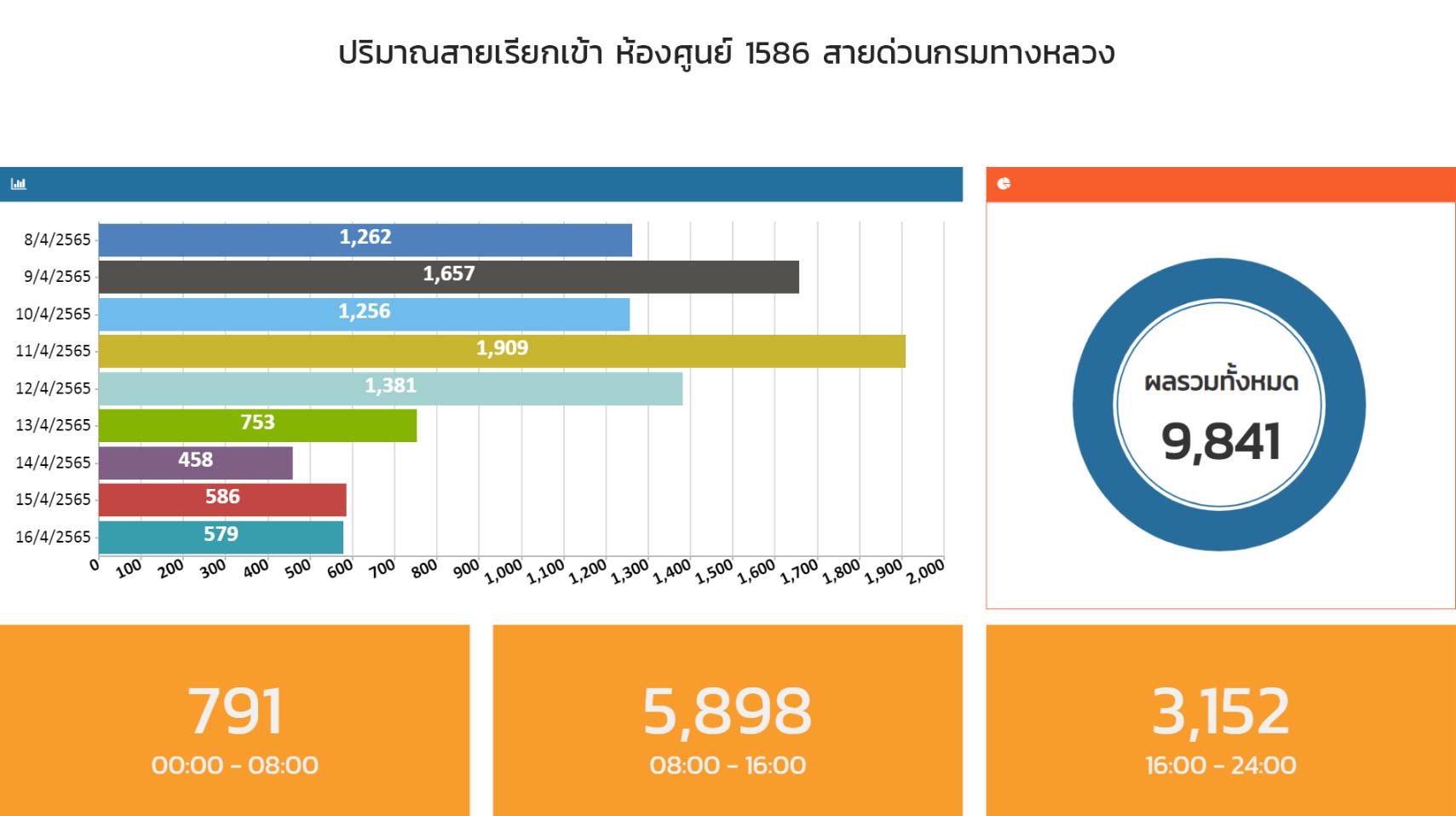 สำหรับจุดให้บริการของกรมทางหลวงในช่วงที่ผ่านมาระหว่างวันที่ 10 – 16 เมษายน 2565 มียอดผู้ใช้บริการสะสมรวม 7 วัน รวม 75,671 ราย รถบริการช่วยเหลือฉุกเฉิน 1,443 ครั้ง และจุดบริการห้องน้ำ 87,130 ครั้ง และยอดการให้บริการสายด่วนกรมทางหลวง 1586 ยอดสะสมตั้งแต่วันที่ 8 - 16 เมษายน 2565 มียอดรวมการให้บริการ 9,841 ครั้ง
