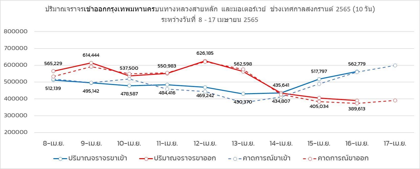 โดยช่วงที่ผ่านมาระหว่างวันที่ 8 - 16 เมษายน 2565 มีจำนวนปริมาณจราจรเข้าและออกกรุงเทพมหานคร รวมทั้งสิ้น 9,072,506 คัน โดยแบ่งเป็นฝั่งขาเข้าจำนวน 4,386,113 คัน และฝั่งขาออกจำนวน 4,686,393 คัน