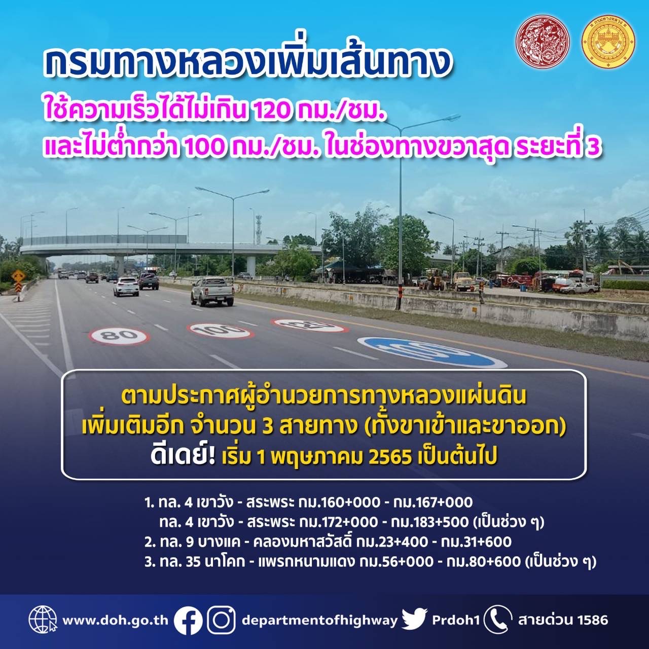 นายสราวุธ ทรงศิวิไล อธิบดีกรมทางหลวง เปิดเผยว่า ตามที่กรมทางหลวง ได้เริ่มเปิดให้รถวิ่งใช้อัตราความเร็วไม่เกิน 120 กม./ชม.(เฉพาะช่องทางขวาสุด) ในเส้นทางนำร่อง (ระยะที่ 1) ที่ ทล. 32 ถนนสายเอเชีย ช่วง บางปะอิน - อ่างทอง กม.4+100 – กม.50+000 ซึ่งเป็นไปตามนโยบายของนายศักดิ์สยาม ชิดชอบ รัฐมนตรีว่าการกระทรวงคมนาคม โดยได้เปิดเป็นทางการไปเมื่อวันที่ 1 เมษายน 2564 เพื่อให้ประชาชนผู้ใช้ทางได้รับความสะดวก รวดเร็ว และปลอดภัยในการเดินทาง และได้ประกาศให้ใช้ความเร็ว 120 กม./ชม. ในระยะที่ 2 เพิ่มอีก จำนวน 6 สายทาง เมื่อวันที่ 1 กันยายน 2564 ประกอบด้วย ทล.1 สนามกีฬาธูปะเตมีย์ - ประตูน้ำพระอินทร์ กม.35+000 - กม.45+000 จ.ปทุมธานี ทล.1 หางน้ำหนองแขม - วังไผ่ กม.306+640 - กม.330+600 จ.นครสวรรค์ ทล.2 บ่อทอง - มอจะบก กม.74+500 - กม.88+000 จ.นครราชสีมา ทล.32 อ่างทอง - โพนางดำออก กม. 50+000 - กม.111+473 จ.อ่างทอง,จ.สิงห์บุรี ทล.34 บางนา - ทางเข้าท่าอากาศยานสุวรรณภูมิ กม.1+500 - กม.15+000 จ.สมุทรปราการ และทล. 304 คลองหลวงแพ่ง - ฉะเชิงเทรา กม.53+300 - กม.63+000 จ.ฉะเชิงเทรา