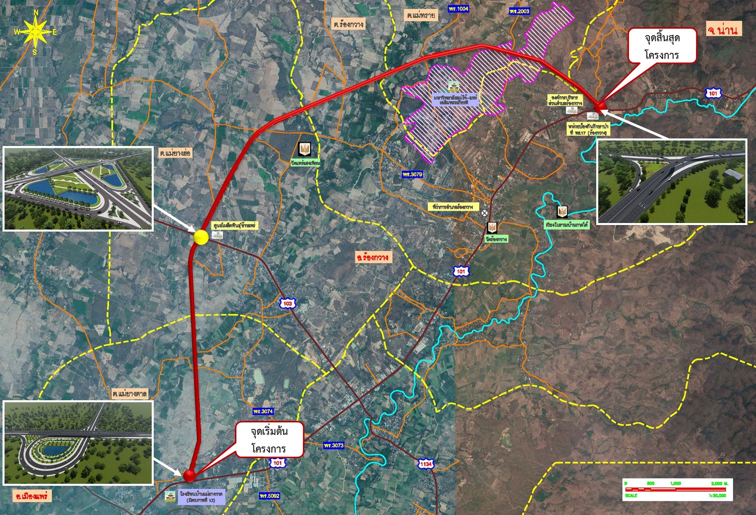 *1) ทางแยกต่างระดับ (บริเวณจุดตัด ทล. 101 (จุดเริ่มต้นโครงการ)) เป็นรูปแบบสามแยก 2 ระดับในลักษณะทรัมเป็ต (Trumpet Type) โดยออกแบบสะพานบนทางหลวงหมายเลข 101 ถนนระดับพื้นในทิศทางการจราจรจากแนวเส้นทางโครงการลอดใต้สะพานเพื่อเลี้ยวขวาไปเมืองแพร่ ส่วนทิศทางการจราจรจากน่านเลี้ยวขวาไป จ.พะเยา ใช้สะพานตามทางหลวงหมายเลข 101 วนซ้ายลอดใต้สะพานตามแนวทางหลวงหมายเลข 101 ไปตามแนวเส้นทางของโครงการ