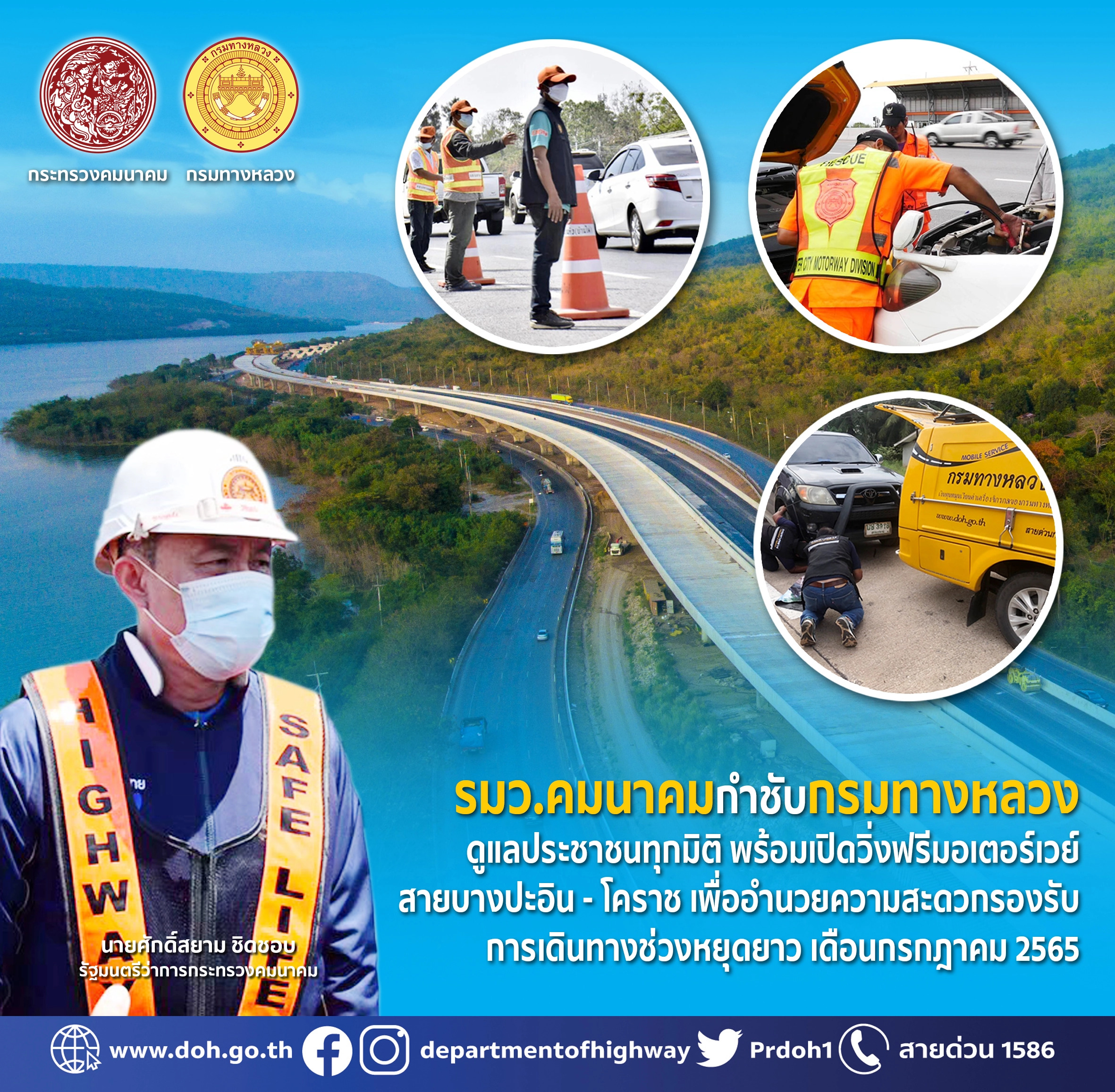 รมว.คมนาคมกำชับกรมทางหลวงดูแลประชาชนทุกมิติ พร้อมเปิดวิ่งฟรีมอเตอร์เวย์สายบางปะอิน - โคราช เพื่ออำนวยความสะดวกรองรับการเดินทางช่วงหยุดยาวเดือนกรกฎาคม 2565