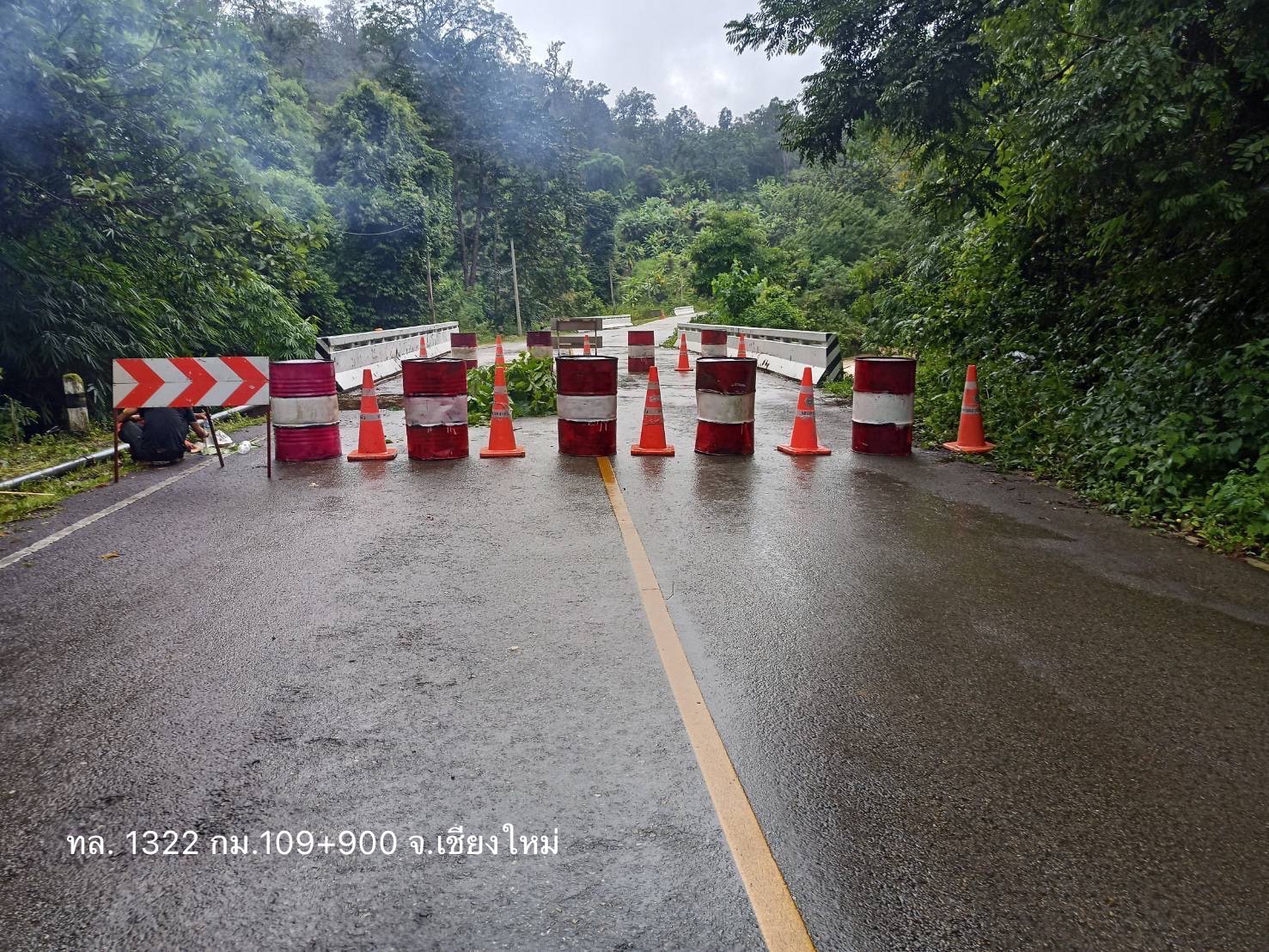 - ทางหลวงหมายเลข 1322 แม่จา – รินหลวง พื้นที่อำเภอเชียงดาว ช่วงกม.ที่ 109+900 เกิดคอสะพานชำรุด เนื่องจากฝนตกหนักติดต่อกันหลายวันทำให้น้ำไหลกัดเซาะริมคันทาง ขณะนี้อยู่ระหว่างการซ่อมแซม และกรมทางหลวงได้จัดเจ้าหน้าที่คอยอำนวยความสะดวก แนะนำเส้นทางเลี่ยงใช้ทางหลวงหมายเลข 1322 กม.0 สามแยกแม่จา