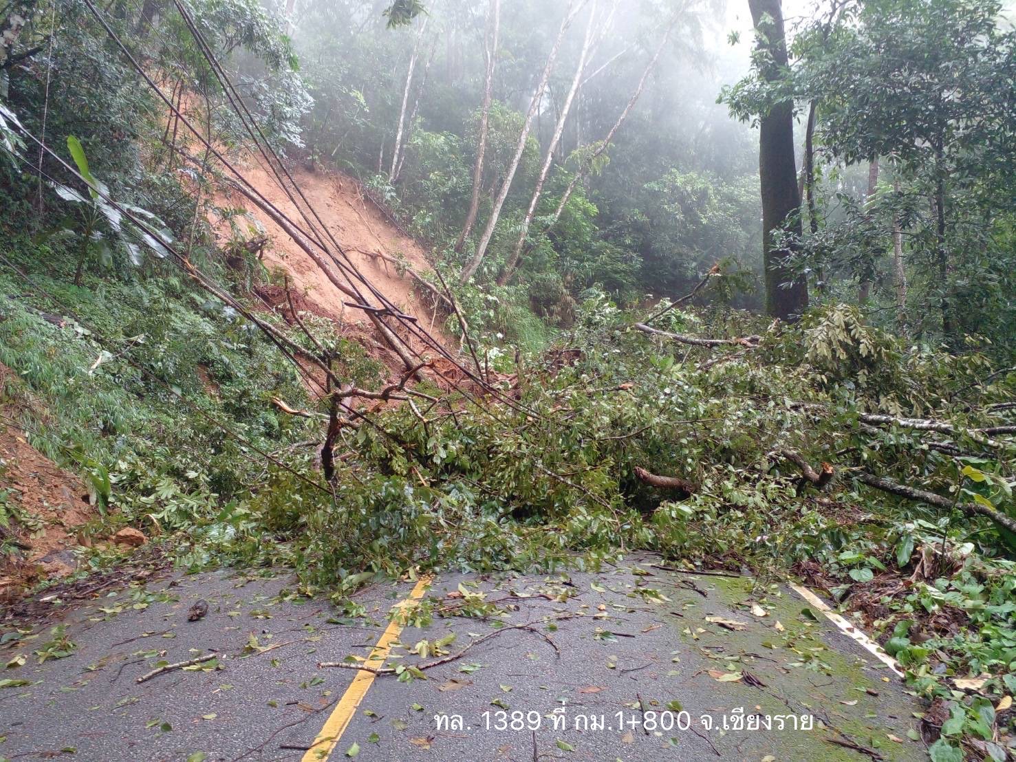 - ทางหลวงหมายเลข 1389 ตอน สถานีเพาะพันธุ์สัตว์ป่าดอยตุง - วัดพระธาตุดอยตุง พื้นที่อำเภอแม่สาย ช่วงกม.ที่ 1+800 ด้านซ้ายทาง ดินสไลด์ปิดทับเส้นทางจราจร 2 ช่องจราจร และเสาไฟฟ้าล้มทับเส้นทางจราจร ปัจจุบันอยู่ระหว่างการเคลื่อนย้ายวัสดุ และกรมทางหลวงได้จัดเจ้าหน้าที่คอยอำนวยความสะดวก แนะนำเส้นทางเลี่ยง ใช้ทางหลวงหมายเลข 1149
