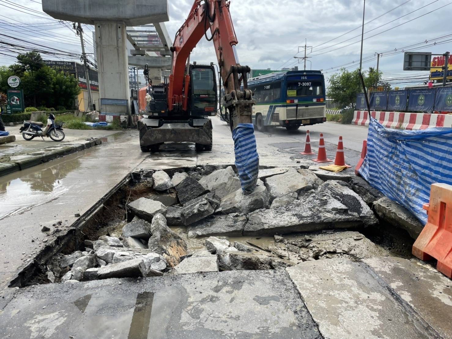 2. ดำเนินการแก้ไขเพื่อคืนพื้นผิวจราจรให้สามารถเปิดการสัญจรชั่วคราวโดยการรื้อสกัดผิวถนนที่ทรุดตัว หาโพรงที่มีการรั่วซึมและนำทรายหยาบลง พร้อมเทคอนกรีต high strength fast setting แล้วปูแผ่นเหล็กทับชั่วคราว ซึ่งคาดว่าจะแล้วเสร็จและเปิดการจราจรตามปกติได้ในเวลาประมาณ 18.30 น. ของวันนี้ (11 กันยายน 2565) เพื่ออำนวยความสะดวกในการเดินทางให้กับประชาชน