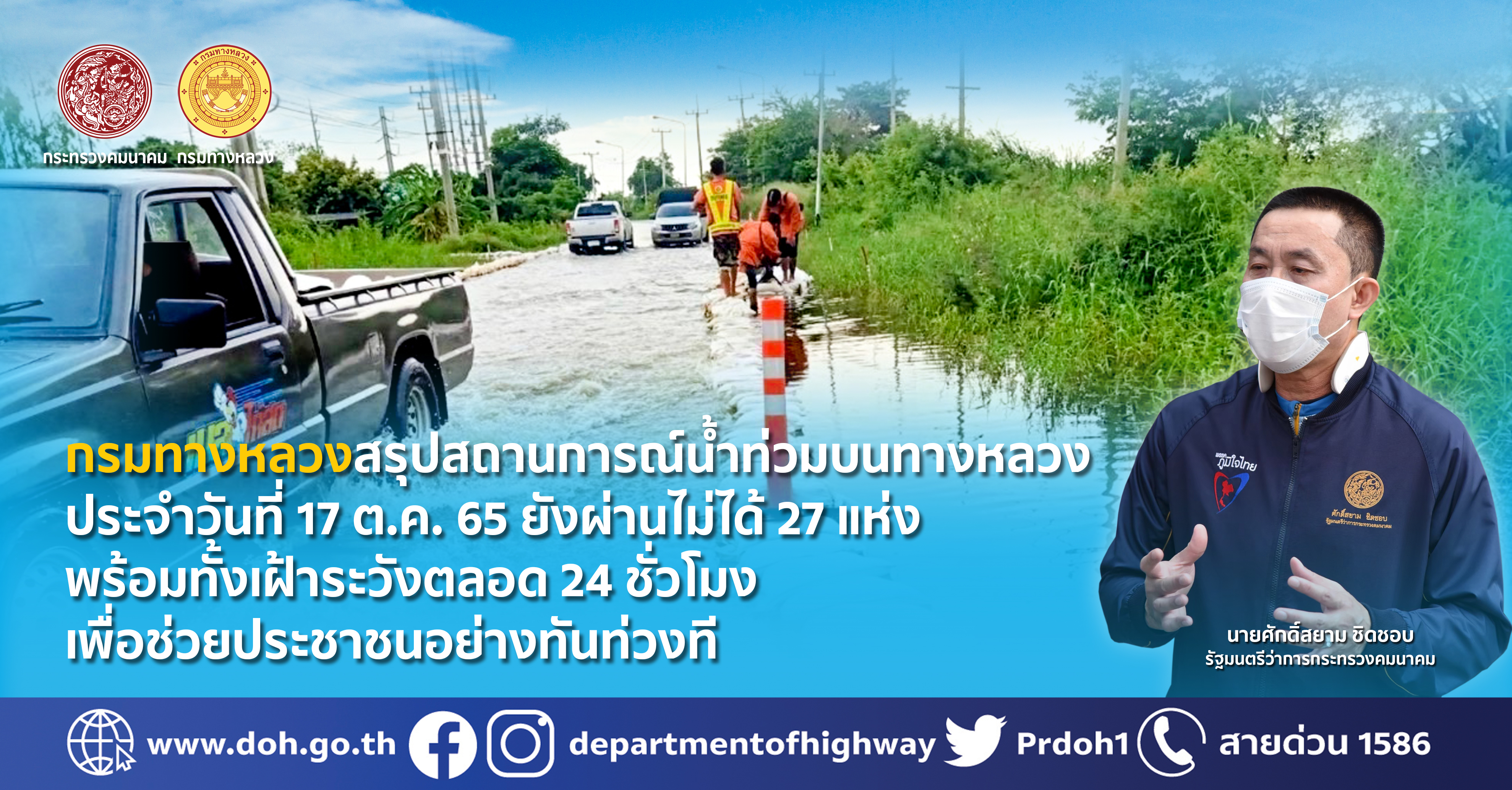 นายสราวุธ ทรงศิวิไล อธิบดีกรมทางหลวง เปิดเผยว่า จากสถานการณ์น้ำท่วมในหลายพื้นที่ ส่งผลให้ทางหลวงบางเส้นทางมีน้ำท่วมสูงเป็นเหตุให้ไม่สามารถใช้สัญจรได้ตามปกติ กรมทางหลวงได้สั่งการให้ สำนักงานทางหลวง แขวงทางหลวง หมวดทางหลวงทั่วประเทศ เฝ้าระวัง และติดตามสถานการณ์อย่างใกล้ชิด หากพื้นที่ใดประสบปัญหาก็จะระดมบุคลากร นำเครื่องจักรและวัสดุอุปกรณ์เข้าให้การช่วยเหลือเพื่อเร่งระบายน้ำและบรรเทาความเดือดร้อนโดยเร็วที่สุด พร้อมกำชับให้ผู้บริหารในพื้นที่ติดตามสถานการณ์อย่างใกล้ชิด นอกจากนี้ยังติดตั้งป้ายเตือนและอุปกรณ์อำนวยความปลอดภัยแก่ผู้ใช้เส้นทาง ในขณะที่บางจังหวัดก็มีการล้างทำความสะอาดถนนหลังจากน้ำลดลงบ้างแล้ว เพื่อบรรเทาความเดือดร้อนของประชาชนให้ได้รับความสะดวกปลอดภัยในการสัญจรโดยเร็วที่สุดอย่างต่อเนื่อง ตามข้อสั่งการของ นายศักดิ์สยาม ชิดชอบ รัฐมนตรีว่าการกระทรวงคมนาคม ที่มีความห่วงใยประชาชนผู้ประสบภัยในครั้งนี้ พร้อมทั้งเฝ้าระวังตลอด 24 ชั่วโมง เพื่อช่วยประชาชนอย่างทันท่วงที พร้อมกันนี้กรมทางหลวง ได้ทำการสรุปสถานการณ์อุทกภัยและดินสไลด์บนทางหลวง โดย สถานการณ์ประจำวันที่ 17 ตุลาคม 2565 เวลา 12.30 น. พบทางหลวงถูกน้ำท่วม/ดินสไลด์ ในพื้นที่ 12 จังหวัด ได้แก่ จ.ขอนแก่น, จ.ศรีสะเกษ, จ.นครราชสีมา ,จ.หนองบัวลำภู , จ.อุบลราชธานี, จ.มหาสารคาม, จ.ยโสธร, จ.นครปฐม, จ.อ่างทอง, จ.พระนครศรีอยุธยา, จ.สิงห์บุรี และ จ.นครสวรรค์ จำนวน 28 สายทาง 38 แห่ง การจราจรผ่านไม่ได้ 27 แห่ง ดังนี้