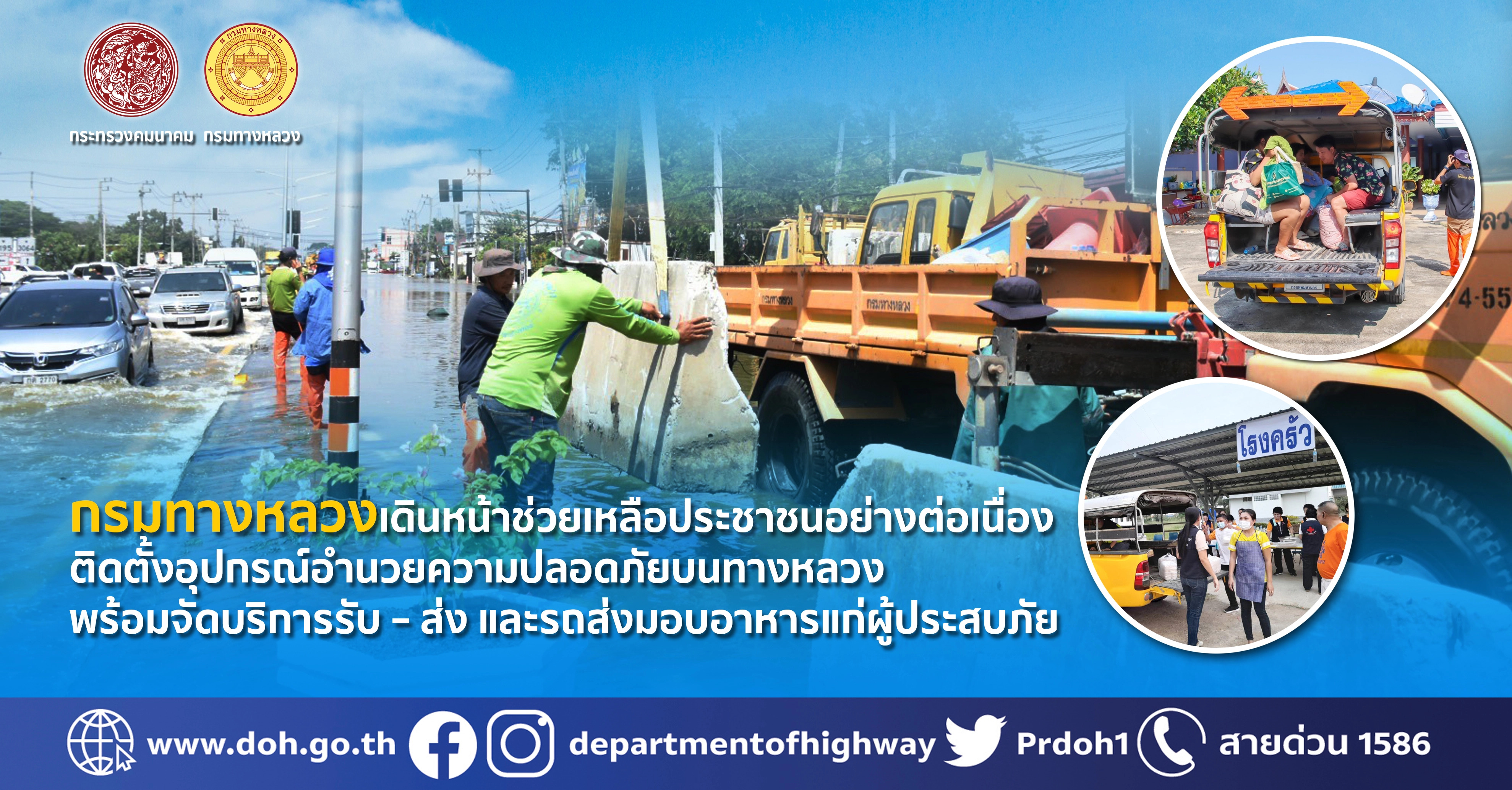 นายสราวุธ ทรงศิวิไล อธิบดีกรมทางหลวง เปิดเผยว่า จากสถานการณ์น้ำท่วมในหลายพื้นที่ ส่งผลให้ทางหลวงบางเส้นทางมีน้ำท่วมสูงเป็นเหตุให้ไม่สามารถใช้สัญจรได้ตามปกติ กรมทางหลวงได้สั่งการให้ สำนักงานทางหลวง แขวงทางหลวง หมวดทางหลวงทั่วประเทศ ลงพื้นที่ติดตามสถานการณ์น้ำท่วม อย่างใกล้ชิด แขวงทางหลวงอ่างทองได้มีการติดตั้งอุปกรณ์สิ่งอำนวยความปลอดภัยเพื่อชะลอน้ำไหลผ่าน ให้รถเล็กได้อย่างปลอดภัยบนทางหลวงหมายเลข 3064 ตอน อ่างทอง – ปากดง ระหว่าง กม.4+400 – 9+150 และมีรถบริการ รับ – ส่ง ประชาชน โดยรถจะออกจากโรงพยาบาลโพธิ์ทอง ผ่านสามแยกไฟแดงป่างิ้ว เข้าตัวเมืองอ่างทอง ผ่านหน้าศาลากลางอ่างทอง ผ่านหน้าโรงพยาบาลอ่างทอง แล้ววนกลับเส้นทางเดิม ตั้งแต่เวลา 09.00 น. – 18.00 น. ด้านแขวงทางหลวงกาฬสินธุ์ ได้ให้การสนับสนุนรถเพื่อส่งมอบอาหารให้แก่ผู้ประสบภัยน้ำท่วมในพื้นที่บ้านโนนแดง ตำบลฆ้องชัยพัฒนา อำเภอฆ้องชัย จังหวัดกาฬสินธุ์ ในขณะที่แขวงทางหลวงศรีสะเกษที่ 1 ได้จัดกำลังเจ้าหน้าที่บริการประชาชนลงเรือข้ามฟาก ในพื้นที่ จ.ศรีสะเกษ หากพื้นที่ใดประสบปัญหาก็จะระดมบุคลากร นำเครื่องจักรและวัสดุอุปกรณ์เข้าให้การช่วยเหลือเพื่อเร่งระบายน้ำ ป้องกันเส้นทางไม่ให้เกิดทางขาดอย่างเต็มที่ สำหรับเส้นทางที่น้ำลดแล้วได้มีการสำรวจความเสียหายของ ถนน สะพาน และระบบระบายน้ำ เพื่อบรรเทาความเดือดร้อนของประชาชนให้ได้รับความสะดวกปลอดภัยในการสัญจรโดยเร็วที่สุดอย่างต่อเนื่อง ตามข้อสั่งการของ นายศักดิ์สยาม ชิดชอบ รัฐมนตรีว่าการกระทรวงคมนาคม ที่มีความห่วงใยประชาชนผู้ประสบภัยในครั้งนี้ พร้อมทั้งเฝ้าระวังตลอด 24 ชั่วโมง