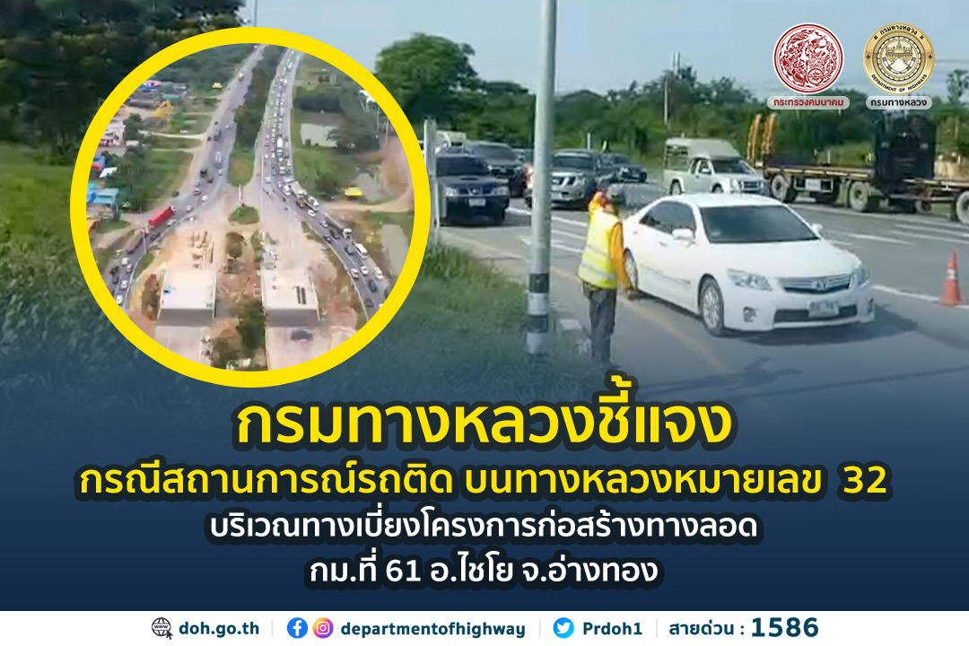 กรมทางหลวงชี้แจง กรณีสถานการณ์รถติด บนทางหลวงหมายเลข 32 บริเวณทางเบี่ยงโครงการก่อสร้างทางลอด กม.ที่ 61 อ.ไชโย จ.อ่างทอง