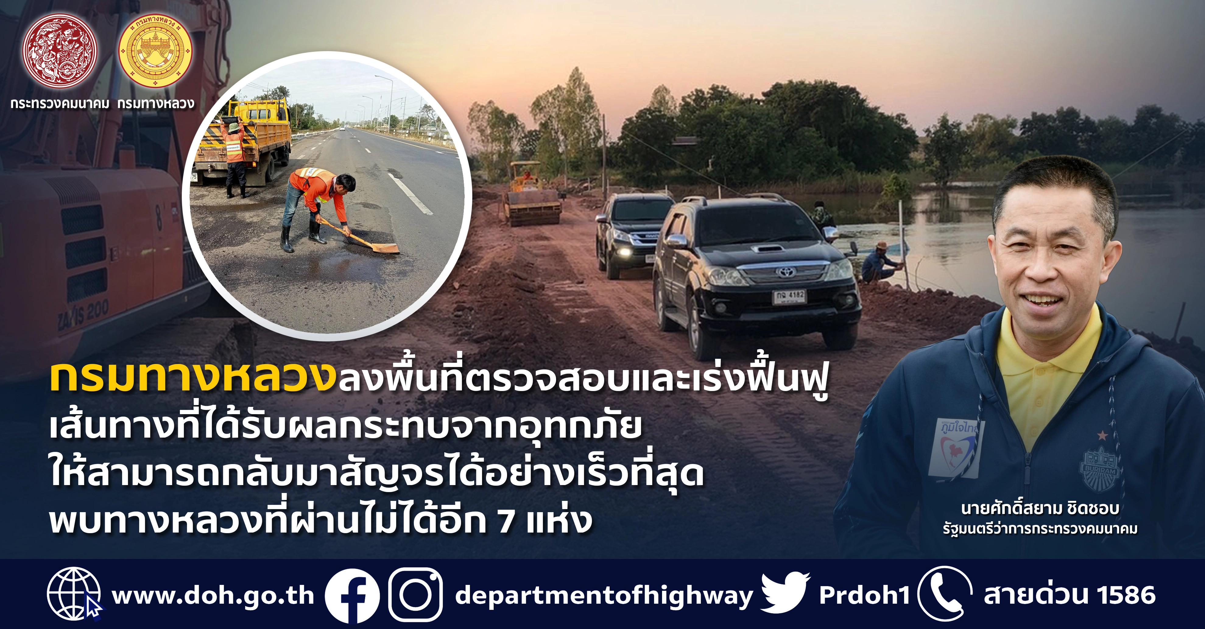 กรมทางหลวงลงพื้นที่ตรวจสอบและเร่งฟื้นฟูเส้นทางที่ได้รับผลกระทบจากอุทกภัย ให้สามารถกลับมาสัญจรได้อย่างเร็วที่สุดพบทางหลวงที่ผ่านไม่ได้อีก 7 แห่ง