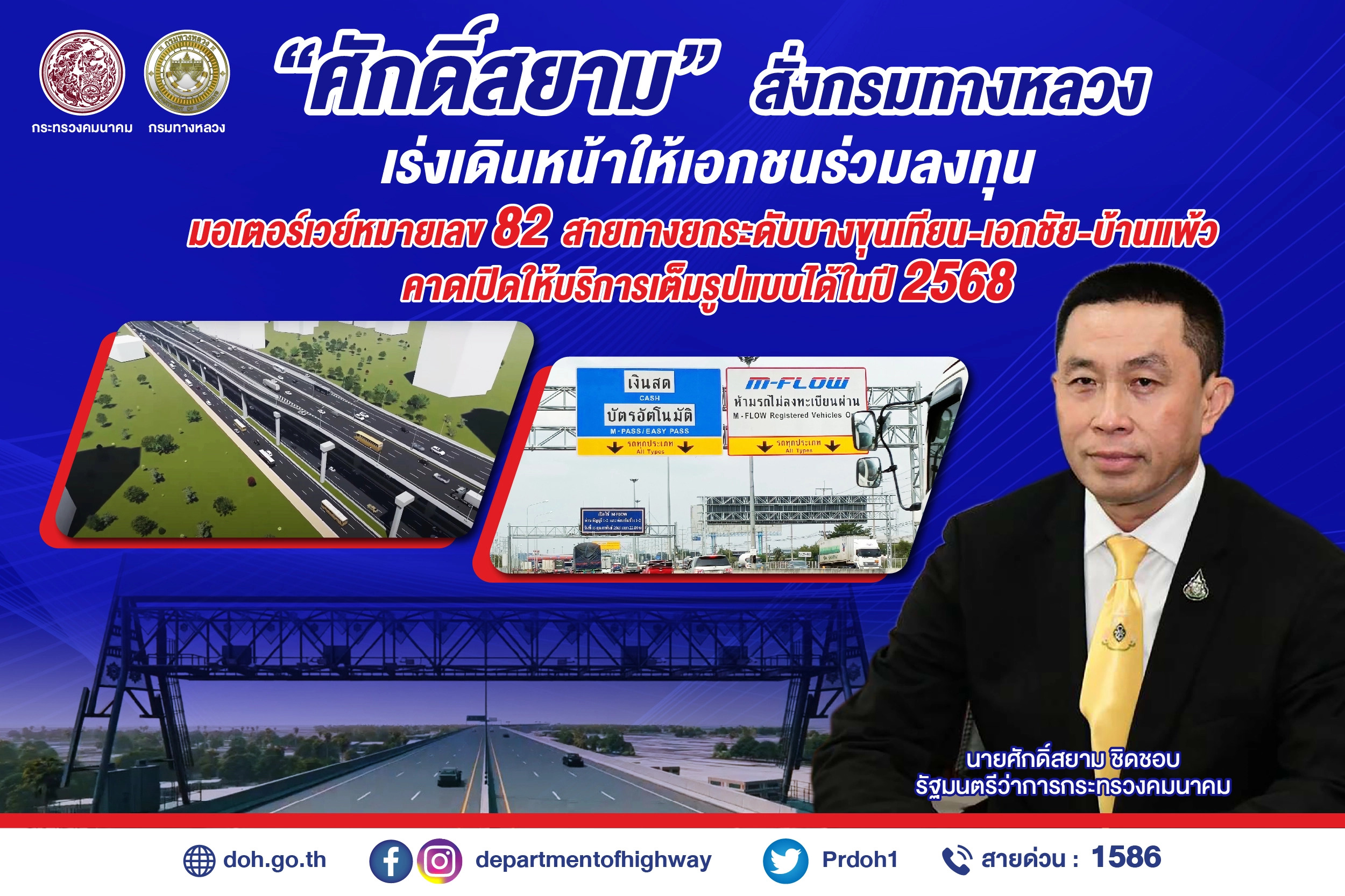 นายสราวุธ ทรงศิวิไล อธิบดีกรมทางหลวง เปิดเผยว่า นายศักดิ์สยาม ชิดชอบ รัฐมนตรีว่าการกระทรวงคมนาคม ได้มอบนโยบาย และสั่งการให้กรมทางหลวงเร่งดำเนินโครงการ PPP. โดยให้เอกชนร่วมลงทุนในการดำเนินงานและบำรุงรักษา (O&M) มอเตอร์เวย์ M82 สายทางยกระดับบางขุนเทียน-เอกชัย-บ้านแพ้ว ตามที่คณะรัฐมนตรี (ครม.) มีมติเห็นชอบในรูปแบบการร่วมลงทุน (PPP) แล้วในวันนี้ (13 ธ.ค. 65)