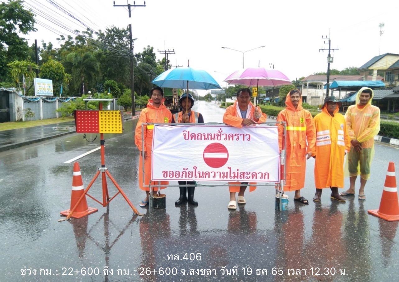 - ทางหลวงหมายเลข 406 ตอน ปากจ่า – ค่ายรวมมิตร ในพื้นที่ อ.รัตภูมิ ช่วง กม.22+700 – 23+330 ระดับน้ำ 30 ซม. ทางเลี่ยงใช้ทางหลวงท้องถิ่น