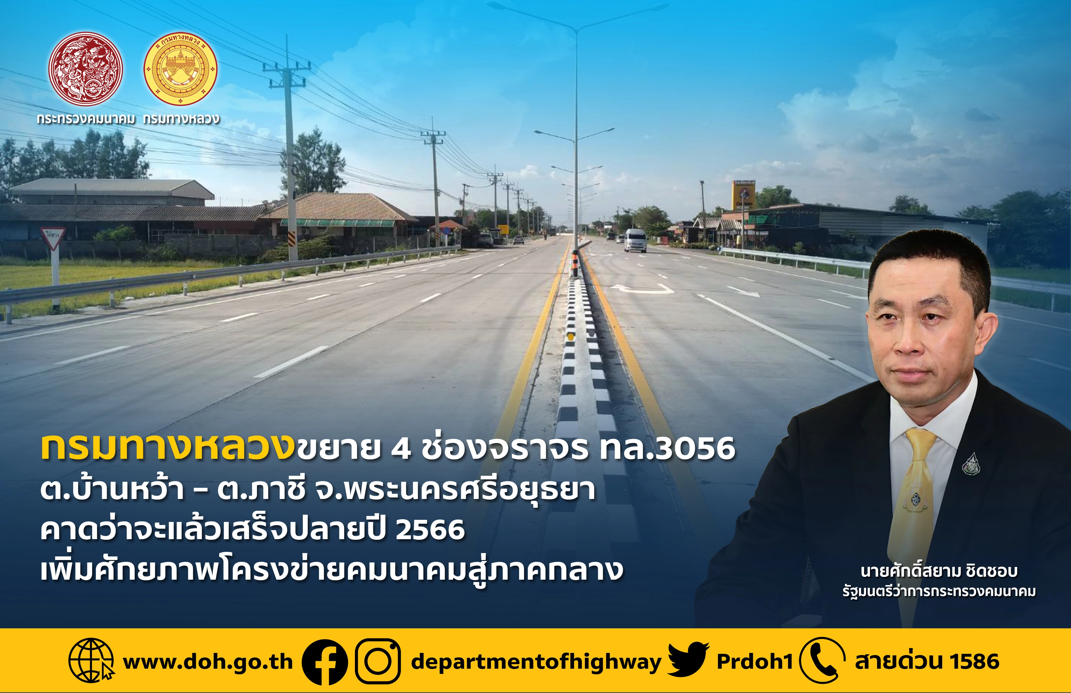 กรมทางหลวง โดยสำนักก่อสร้างทางที่ 1 ได้ดำเนินโครงการก่อสร้างขยายทางหลวงหมายเลข 3056 สาย ต.บ้านหว้า – อ.ภาชี ให้เป็น 4 ช่องจราจร ตลอดสาย โดยมีความคืบหน้าแล้วร้อยละ 90 ในพื้นที่ จ.พระนครศรีอยุธยา ตามนโยบายของ นายศักดิ์สยาม ชิดชอบ รัฐมนตรีว่าการกระทรวงคมนาคม ที่ต้องการพัฒนาด้านคมนาคมและระบบโลจิสติกส์