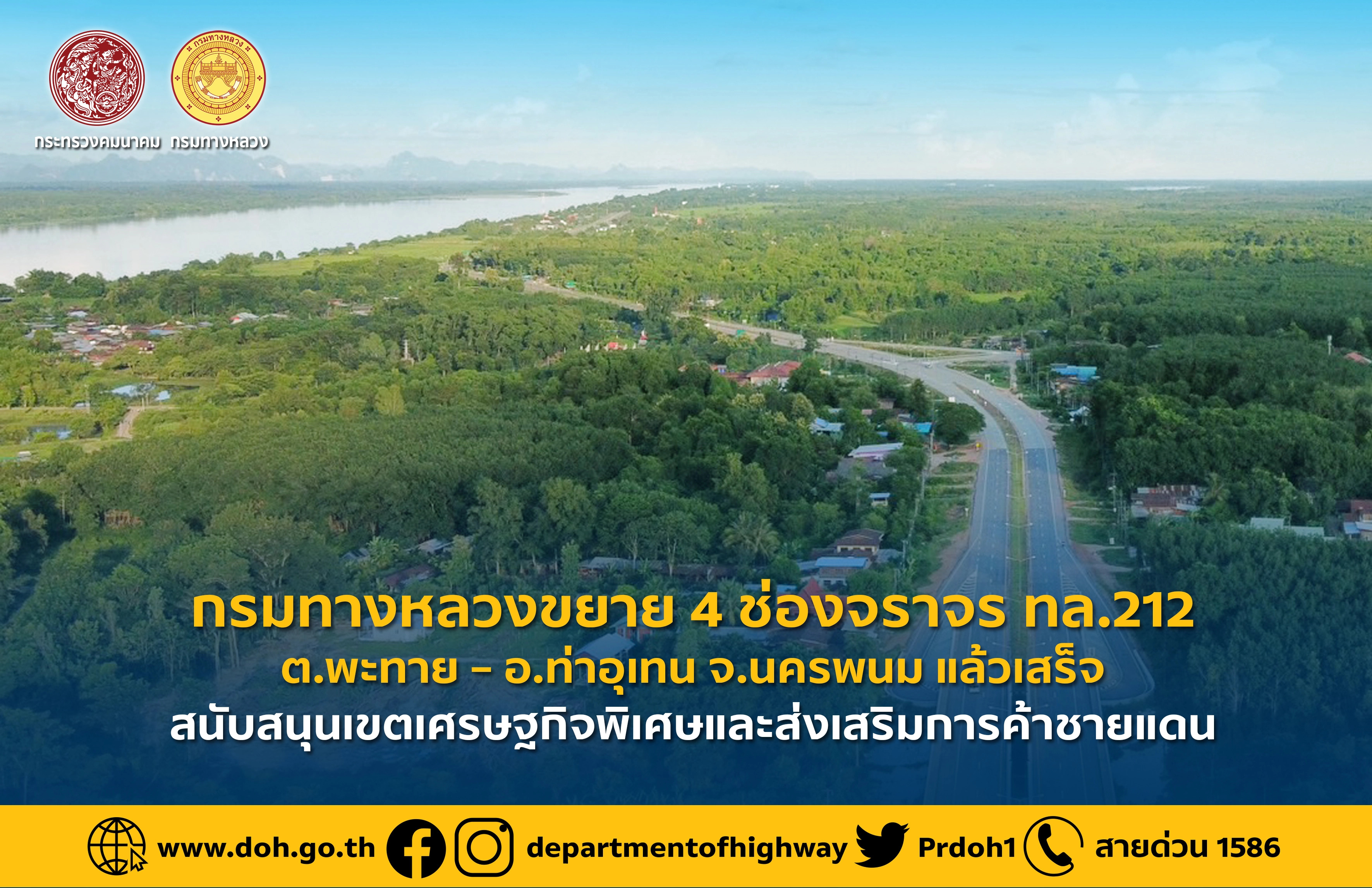 กรมทางหลวงขยาย 4 ช่องจราจร ทล.212 ต.พะทาย – อ.ท่าอุเทน จ.นครพนม แล้วเสร็จสนับสนุนเขตเศรษฐกิจพิเศษและส่งเสริมการค้าชายแดน