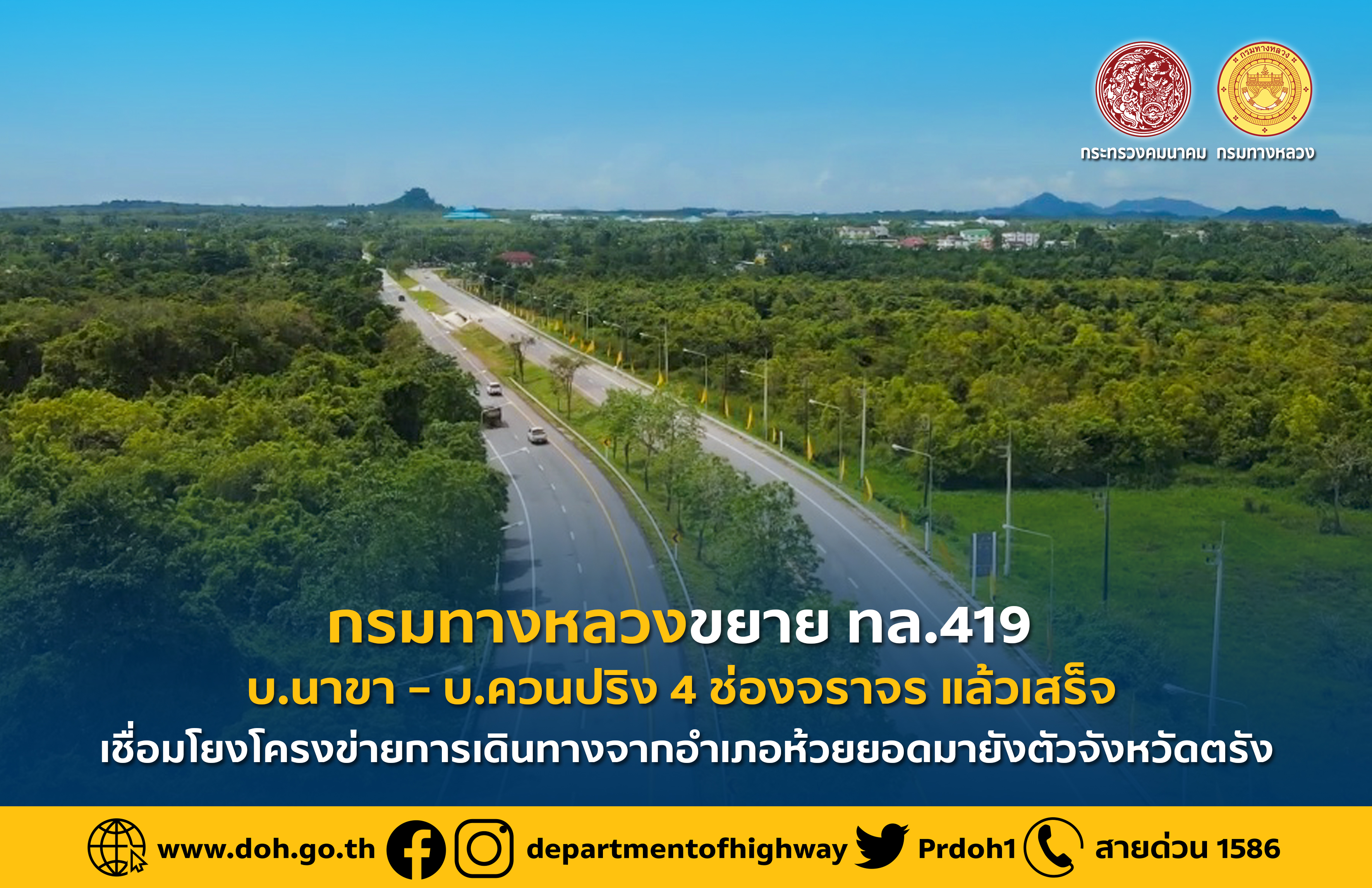กรมทางหลวงขยาย ทล.419 บ.นาขา - บ.ควนปริง 4 ช่องจราจร แล้วเสร็จ เชื่อมโยงโครงข่ายการเดินทางจากอำเภอห้วยยอดมายังตัวจังหวัดตรัง