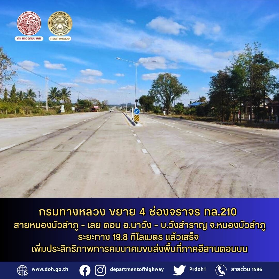 กรมทางหลวง ขยาย 4 ช่องจราจร ทล.210 สายหนองบัวลำภู-เลย ตอน อ.นาวัง-บ.วังสำราญ จ.หนองบัวลำภู ระยะทาง 19.8 กิโลเมตร แล้วเสร็จ เพิ่มประสิทธิภาพการคมนาคมขนส่งในพื้นที่ภาคอีสานตอนบน