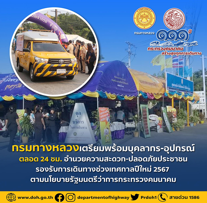 นายสราวุธ ทรงศิวิไล อธิบดีกรมทางหลวง กระทรวงคมนาคม เปิดเผยว่า นายสุริยะ จึงรุ่งเรืองกิจ รัฐมนตรีว่าการกระทรวงคมนาคม มีความห่วงใยพี่น้องประชาชนที่ได้เริ่มทยอยเดินทางกลับภูมิลำเนาและท่องเที่ยวในช่วงวันหยุดยาวช่วงเทศกาลปีใหม่ 2567 จึงมอบนโยบายทุกหน่วยงานในสังกัดกระทรวงคมนาคม เตรียมความพร้อมอำนวยความสะดวกปลอดภัยให้กับประชาชน “เดินทางทั่วไทย คมนาคม สะดวก ปลอดภัย ใส่ใจให้บริการประชาชน” ครอบคลุมทุกมิติ โดยการบูรณาการร่วมกับหน่วยงานในพื้นที่ในการร่วมป้องกันและลดอุบัติเหตุทางถนน เน้นพิเศษเพิ่มความสะดวก รวดเร็ว และปลอดภัยขั้นสูงสุด เพื่อลดการสูญเสียทั้งชีวิตและทรัพย์สิน กรมทางหลวง (ทล.) จึงได้เตรียมความพร้อมในการอำนวยความสะดวกและปลอดภัยในการเดินทางของประชาชน ระหว่างวันที่ 29 ธันวาคม 2566 - 4 มกราคม 2567 โดยสำนักงานทางหลวงและแขวงทางหลวงทั่วประเทศได้ดำเนินการตรวจสอบป้ายจราจร สัญญาณไฟจราจร ไฟฟ้าแสงสว่างให้พร้อมใช้งาน ตรวจสอบและแก้ไขจุดเสี่ยงหรือจุดอันตราย บำรุงรักษาทางหลวงให้อยู่ในสภาพดี อีกทั้งขอความร่วมมือผู้รับจ้างคืนพื้นผิวจราจรในพื้นที่ก่อสร้างให้มีช่องจราจรเท่าเดิมหรือใกล้เคียงของเดิมมากที่สุด และหากพบว่ามีปริมาณจราจรหนาแน่นจะทำการประสานงานกับตำรวจทางหลวงในการสนับสนุนการอำนวยความสะดวกด้านการจราจรหรือการจัดช่องทางพิเศษ (Reversible Lane) เพื่อให้การเดินทางของประชาชนเป็นไปอย่างสะดวกรวดเร็วยิ่งขึ้น รวมทั้ง ทล. ได้จัดตั้งจุดให้บริการทั่วไทย 409 แห่ง แบ่งเป็นจุดให้บริการโดยแขวงทางหลวง กองทางหลวงพิเศษระหว่างเมืองบูรณาการร่วมกับหน่วยงานต่าง ๆ 121 แห่ง จุดให้บริการตำรวจทางหลวง 205 แห่ง และจุดให้บริการสถานีตรวจสอบน้ำหนักและพักรถบรรทุก 83 แห่ง ซึ่งภายในจุดบริการจะมีเจ้าหน้าที่ให้บริการประชาชนผู้ใช้ทางตลอด 24 ชั่วโมง อาทิ การให้ข้อมูลเส้นทาง แนะนำเส้นทางเลือก บริการน้ำดื่ม จัดเตรียมห้องน้ำสะอาดบริการประชาชน 581 แห่ง ในพื้นที่หมวดทางหลวงทั่วประเทศ รถบริการช่วยเหลือฉุกเฉินบนทางหลวง 515 คัน และจัดจุดบริการกางเต็นท์ฟรี 31 แห่งทั่วประเทศ