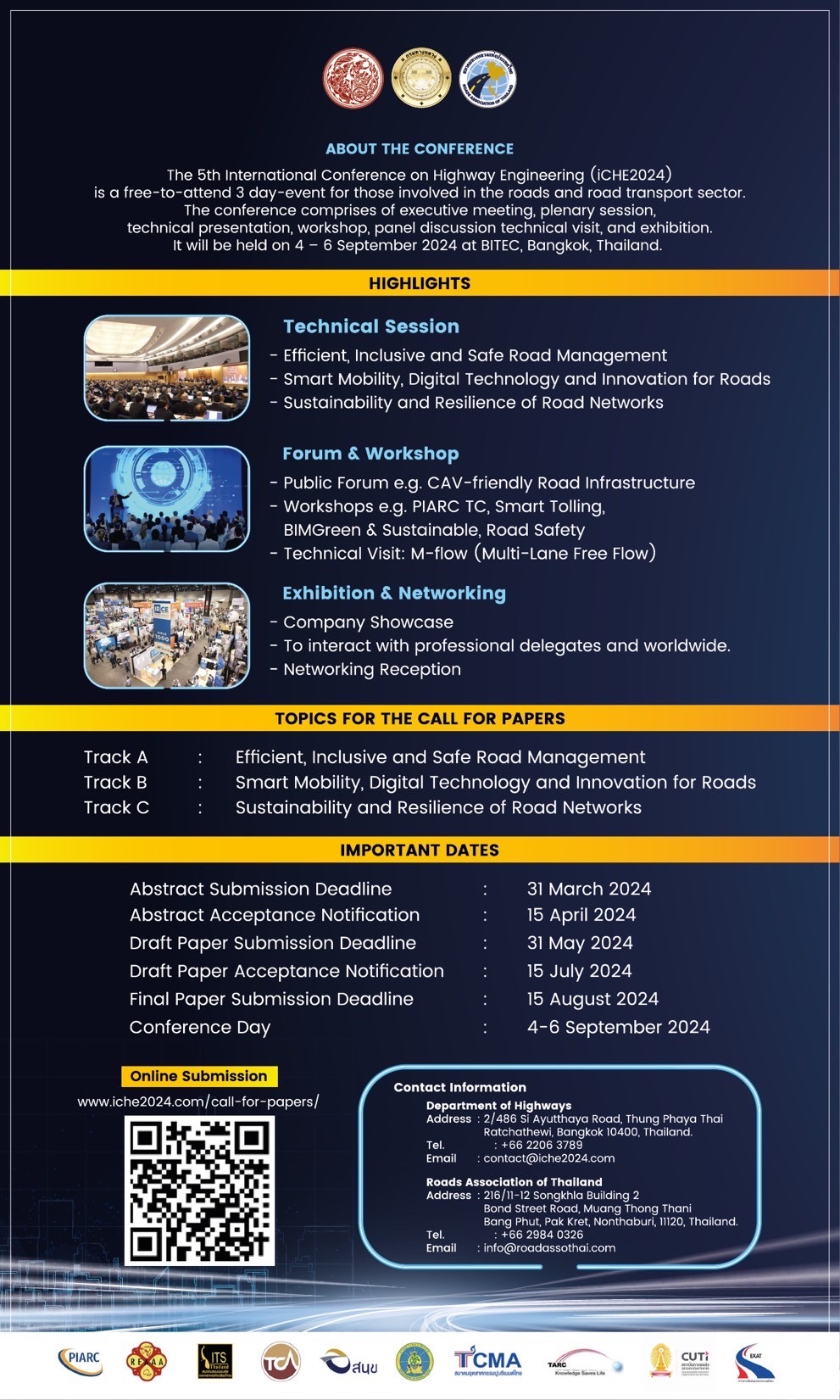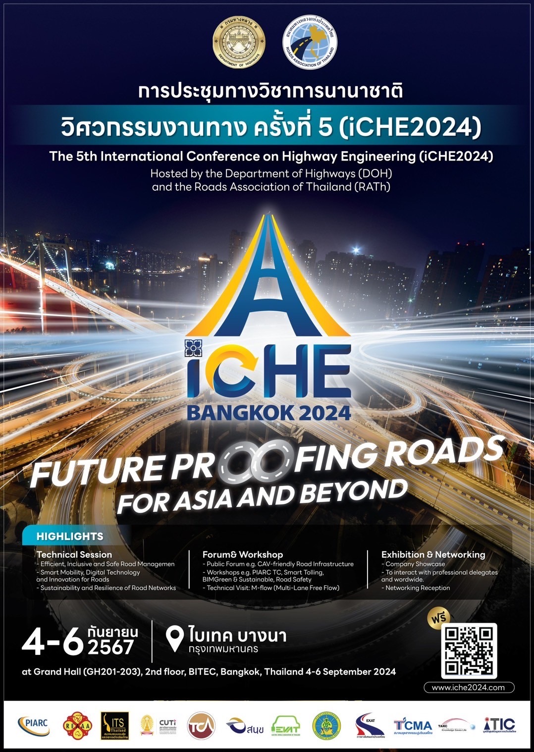 กรมทางหลวง กระทรวงคมนาคม ร่วมกับ สมาคมทางหลวงแห่งประเทศไทย ร่วมกันจัดงานการประชุมทางวิชาการนานาชาติวิศวกรรมงานทาง ครั้งที่ 5 : The 5th International Conference on Highway Engineering ( iCHE 2024 ) ภายใต้แนวคิด Future - proofing Roads for Asia and Beyond ซึ่งจะจัดขึ้นในวันที่ 4 - 6 กันยายน 2567 ณ ศูนย์นิทรรศการและการประชุมไบเทค บางนา กรุงเทพมหานคร