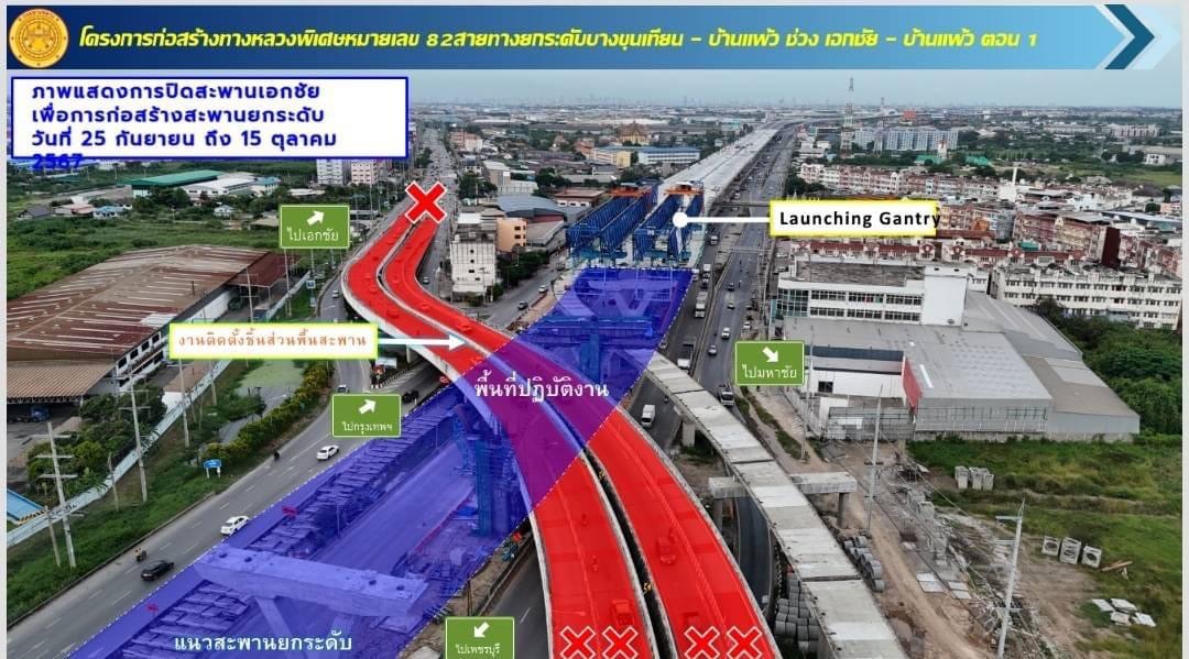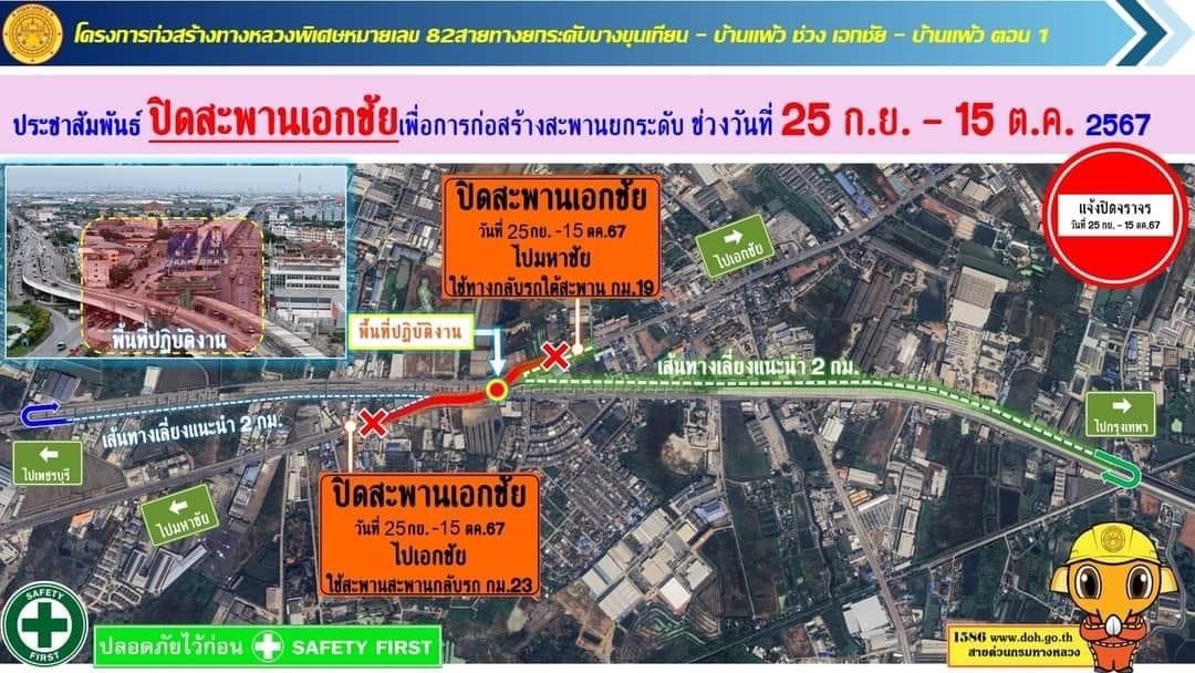 กรมทางหลวง แจ้งปิดการจราจรสะพานต่างระดับเอกชัย พื้นที่ อ.เมือง จ.สมุทรสาคร บนทางหลวงหมายเลข 35 (ถนนพระรามที่ 2) เนื่องจาก โครงการก่อสร้างทางหลวงหมายเลข 82 (M82 ) จะดำเนินการติดตั้งชิ้นส่วนพื้นสะพาน (segment) ที่ กม.21+496.417 หรือ บริเวณสะพานมหาชัยเมืองใหม่