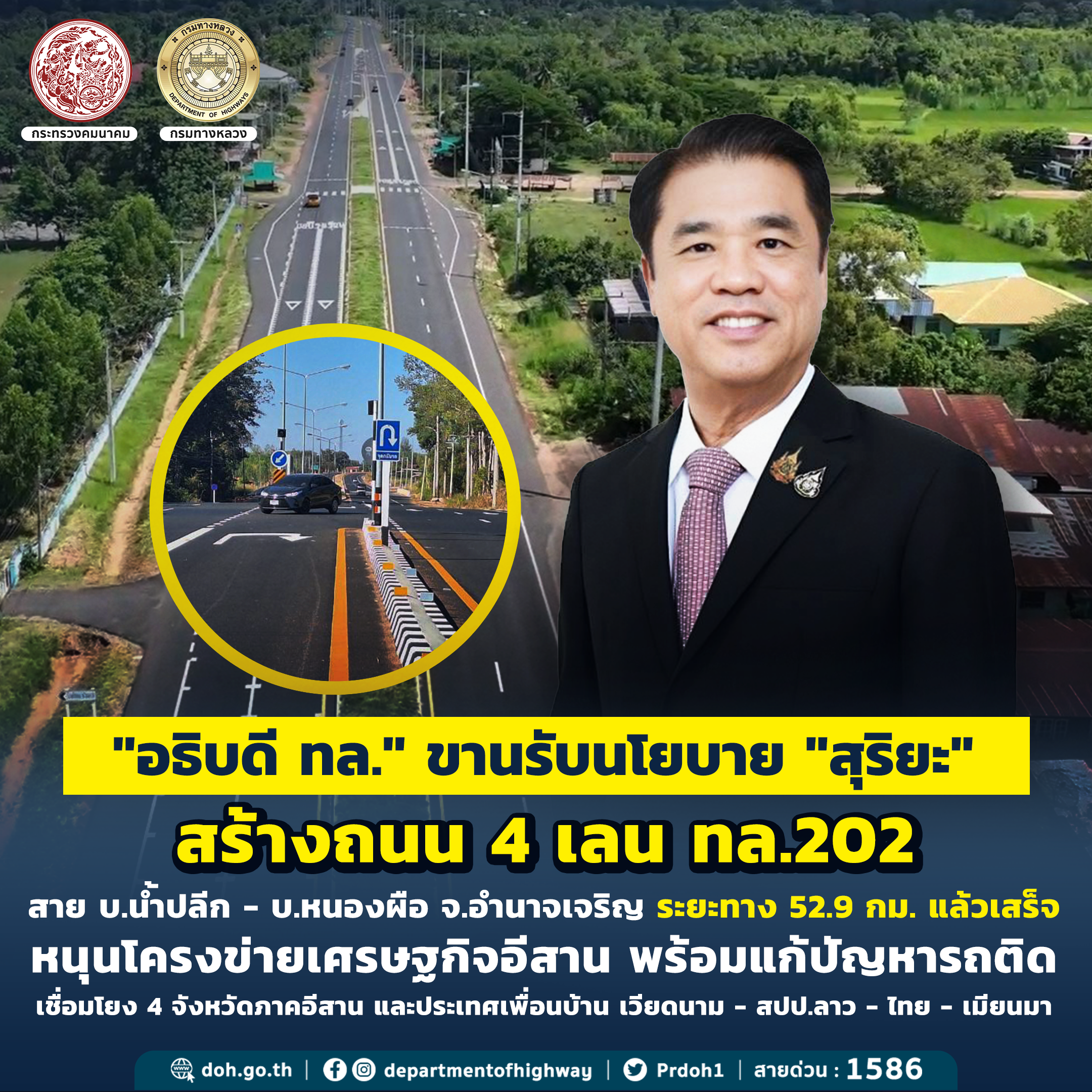 อธิบดีกรมทางหลวง กล่าวต่อว่า ทางหลวงสายดังกล่าวจะเป็นเส้นทางที่เสริมศักยภาพ "โครงข่ายเศรษฐกิจอีสาน" ได้อย่างมีประสิทธิภาพสูงสุด และอำนวยความสะดวกในการเดินทางเชื่อมโยง 4 จังหวัดในภาคอีสาน ได้แก่ จังหวัดร้อยเอ็ด ยโสธร อำนาจเจริญ และอุบลราชธานี ซึ่ง ทล. เล็งเห็นว่าการขนส่งสินค้าในเส้นทางสู่ภาคอีสานนับเป็นส่วนหนึ่งของโครงข่ายทางหลวง Asian Highways เชื่อมโยงเวียดนาม - สปป.ลาว - ไทย - เมียนมา ซึ่งจะช่วยส่งเสริมบทบาทของประเทศไทยในการเป็นศูนย์กลางคมนาคมขนส่งในภูมิภาคอาเซียนอย่างยั่งยืน ทั้งนี้ ทล. มุ่งมั่นพัฒนาโครงสร้างพื้นฐานด้านคมนาคมขนส่งของประเทศอย่างต่อเนื่อง ช่วยบรรเทาปัญหาการจราจรติดขัด ลดความเสี่ยงการเกิดอุบัติเหตุ เพิ่มความสะดวก รวดเร็ว ในการเดินทางเชื่อมโยงการคมนาคมขนส่งระหว่างอำเภอ จังหวัด และประเทศเพื่อนบ้าน เพื่อยกระดับคุณภาพชีวิตของประชาชน ส่งเสริมการกระตุ้นเศรษฐกิจของรัฐบาลในทุก ๆ ด้าน ทั้งการค้า การลงทุน และการท่องเที่ยว