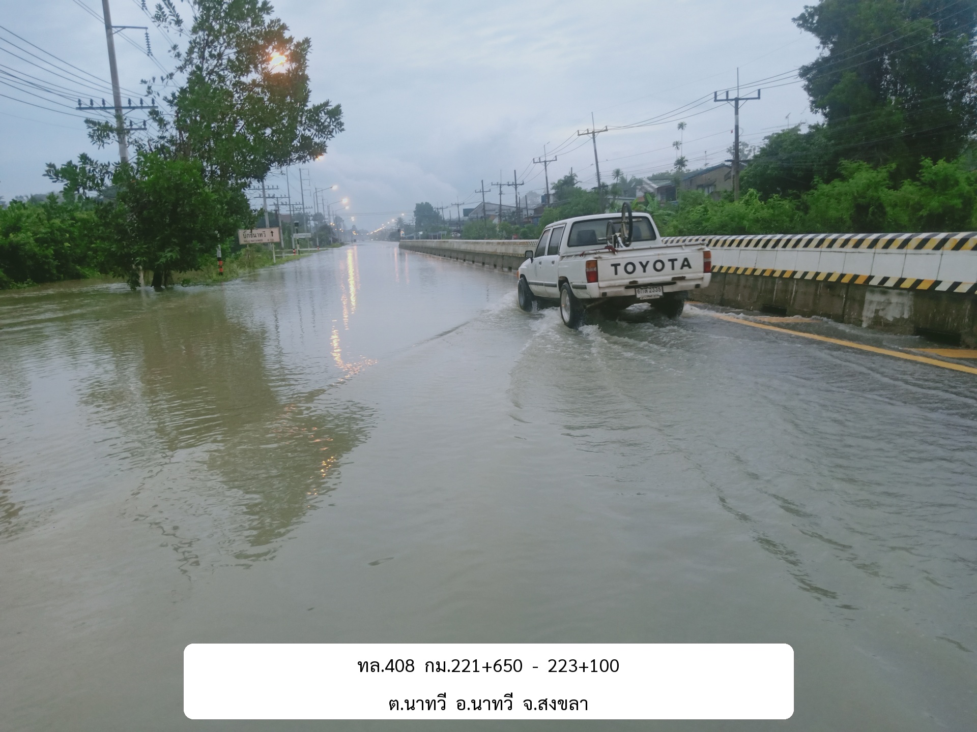 ทล.410 ปัตตานี – ยะลา ช่วง กม.ที่ 2+750 - 4+900 อ.เมืองปัตตานี ระดับน้ำ 50 ซม. ใช้ทางเลี่ยง ทล.43 แทน