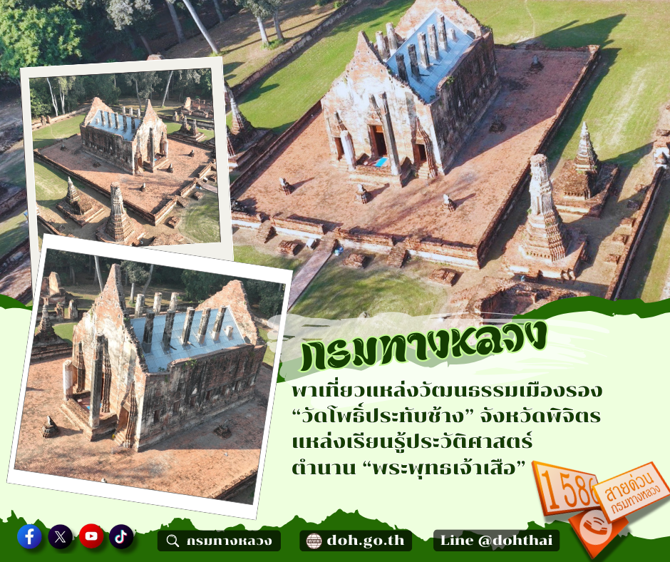 กรมทางหลวง (ทล.) ขอเชิญชวนประชาชนเที่ยวแหล่งเรียนรู้ด้านวัฒนธรรมทางประวัติศาสตร์ “วัดโพธิ์ประทับช้าง” อำเภอโพธิ์ประทับช้าง จังหวัดพิจิตร ชมวัฒนธรรมทางประวัติศาสตร์สมัยกรุงศรีอยุธยา ซึ่งเป็นวัดเก่าแก่สร้างขึ้นเมื่อ พ.ศ. 2242 - 2244 สมัยสมเด็จพระสุริเยนทราธิบดี หรือสมเด็จพระศรีสรรเพชญที่ 8 หรือพระพุทธเจ้าเสือ พระนามเดิม คือขุนหลวงสรศักดิ์ แห่งกรุงศรีอยุธยา เพื่อเป็นอนุสรณ์สถาน เนื่องจากเป็นสถานที่ประสูติของพระองค์