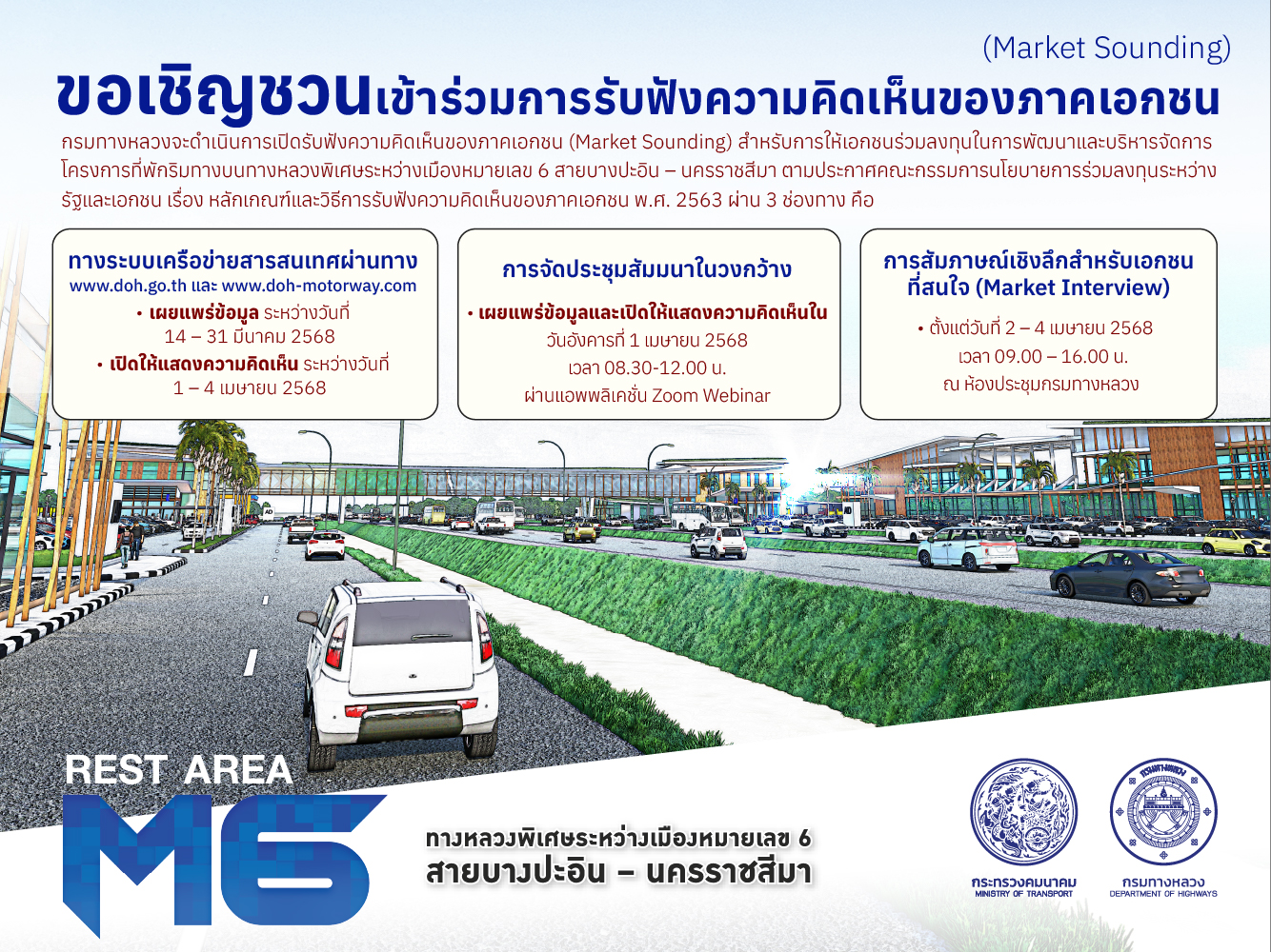 กรมทางหลวงจะดำเนินการเปิดรับฟังความคิดเห็นภาคเอกชน (Market Sounding) สำหรับการให้เอกชนร่วมลงทุนในการพัฒนาและบริหารจัดการโครงการที่พักริมทางบนทางหลวงพิเศษระหว่างเมืองหมายเลข 6