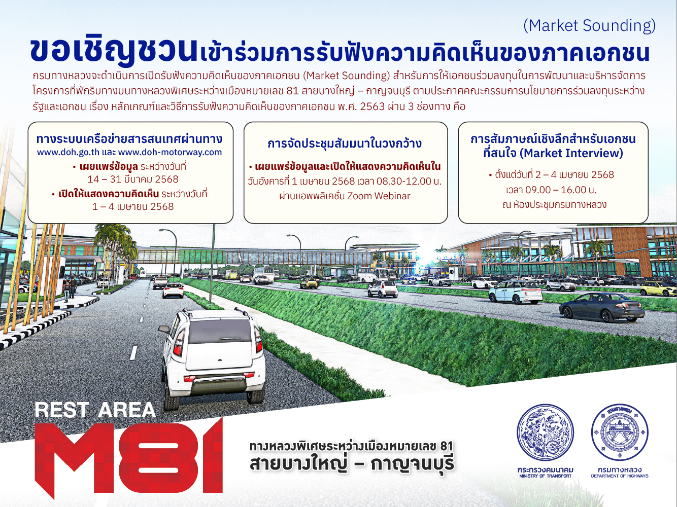กรมทางหลวงเปิดรับฟังความคิดเห็นภาคเอกชน (Market Sounding) สำหรับการให้เอกชนร่วมลงทุนในการพัฒนาและบริหารจัดการโครงการที่พักริมทางบนทางหลวงพิเศษระหว่างเมืองหมายเลข 81 สายบางใหญ่-กาญจนบุรี