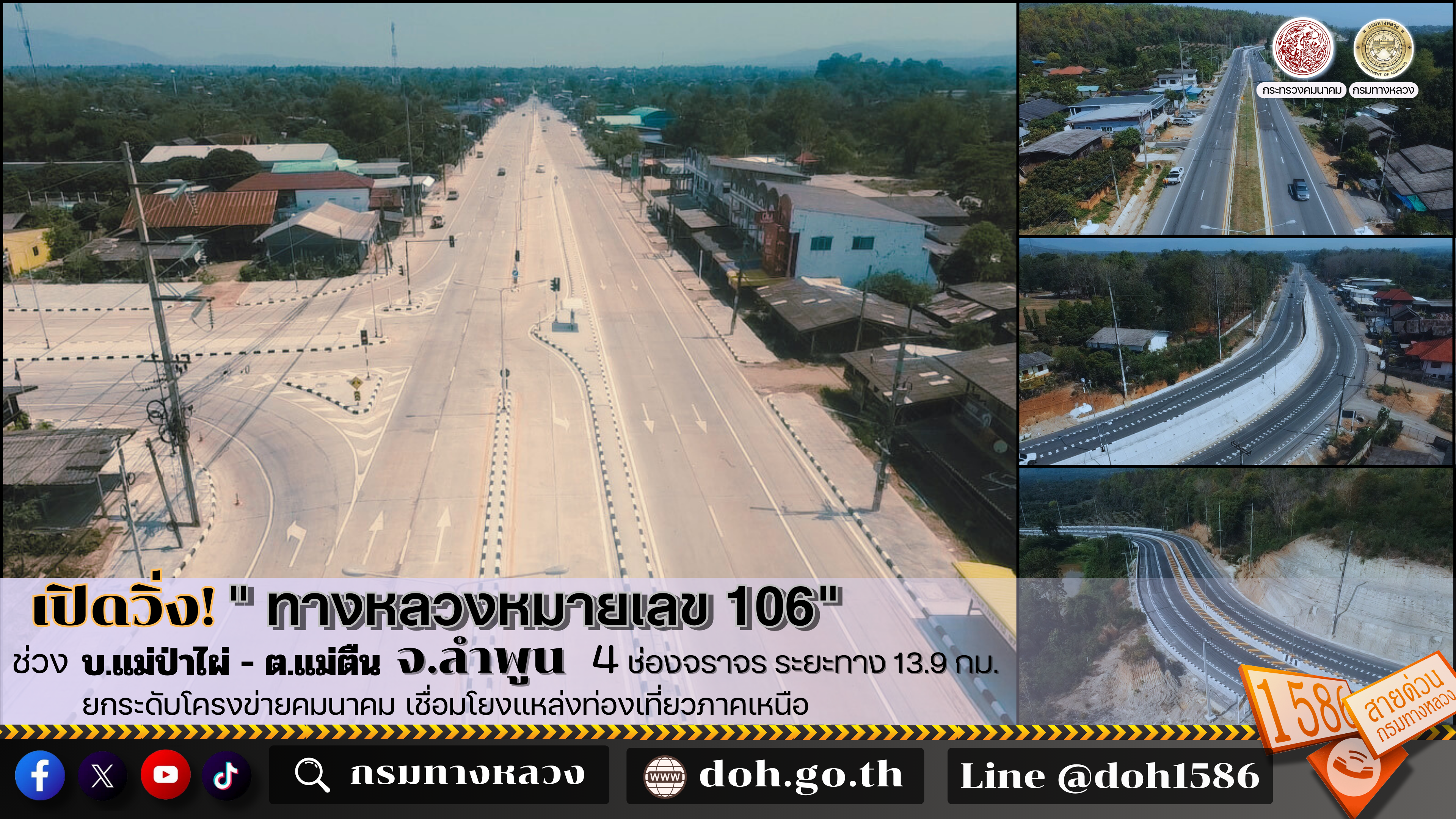 เปิดวิ่ง! ทางหลวงหมายเลข 106 ช่วง บ.แม่ป่าไผ่ - ต.แม่ตืน จ.ลำพูน 4 ช่องจราจร ระยะทาง 13.9 กม. ยกระดับโครงข่ายคมนาคม เชื่อมโยงแหล่งท่องเที่ยวภาคเหนือ และส่งเสริมการพัฒนาเศรษฐกิจภูมิภาค