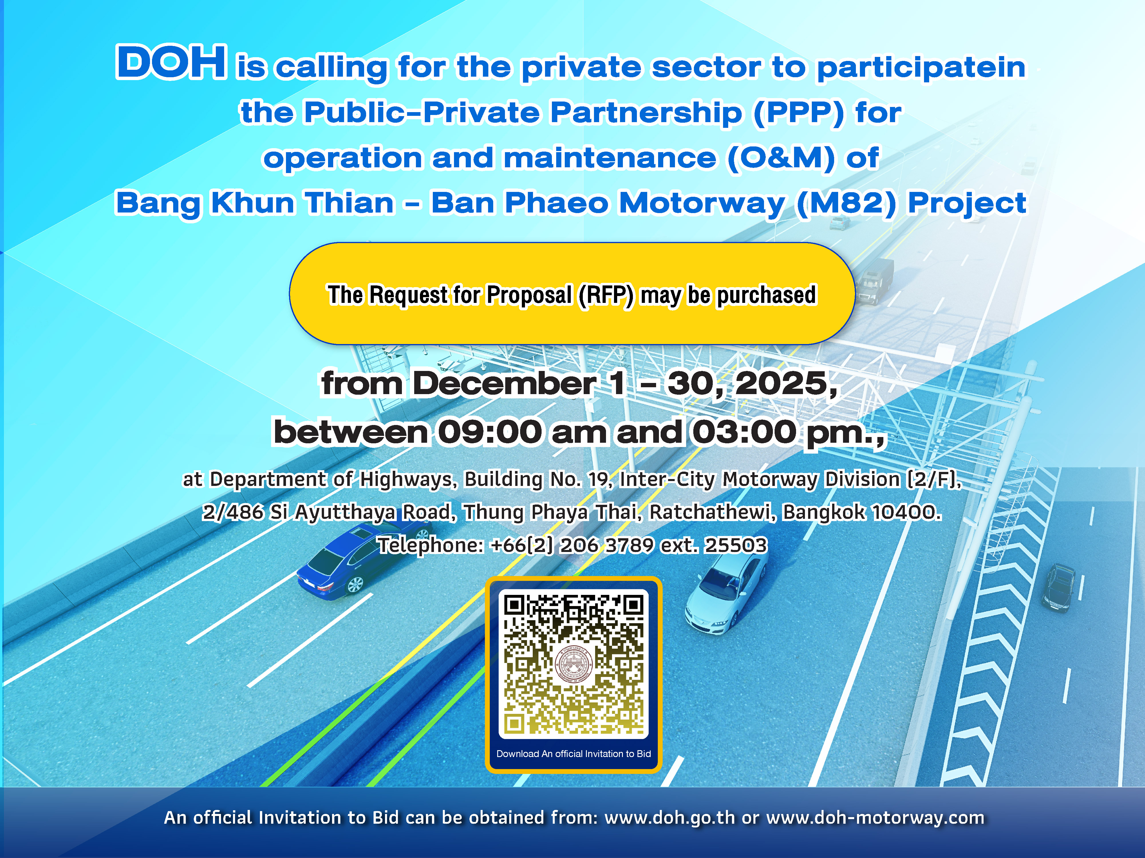 กรมทางหลวง กระทรวงคมนาคม แห่งราชอาณาจักรไทย ขอประกาศเชิญชวนเอกชนที่สนใจเข้าร่วมการคัดเลือกเอกชนร่วมลงทุน สำหรับการดำเนินงานและบำรุงรักษา (O&M) โครงการทางหลวงพิเศษหมายเลข 82 สายทางยกระดับบางขุนเทียน-บ้านแพ้ว โดยเปิดให้เอกชนเข้ามาร่วมลงทุนในการออกแบบและก่อสร้างงานระบบและองค์ประกอบที่เกี่ยวข้อง รวมทั้งเป็นผู้ดำเนินงานและบำรุงรักษาทั้งหมดสำหรับโครงการ ครอบคลุมทั้งในส่วนของ งานโยธาที่รัฐเป็นผู้ลงทุนและงานระบบที่เอกชนเป็นผู้ลงทุน โดยภาครัฐเป็นเจ้าของกรรมสิทธิ์ทรัพย์สินที่เอกชนลงทุนก่อสร้าง รวมถึงรายได้ทั้งหมดจากค่าธรรมเนียมผ่านทาง ส่วนเอกชนจะได้รับค่าตอบแทนจากการให้บริการเป็นค่าก่อสร้างงานระบบและองค์ประกอบที่เกี่ยวข้อง ค่าดำเนินงานและบำรุงรักษาตามขอบเขตและเงื่อนไขที่กำหนดภายใต้แนวทางการให้เอกชนร่วมลงทุนในรูปแบบ PPP Gross Cost